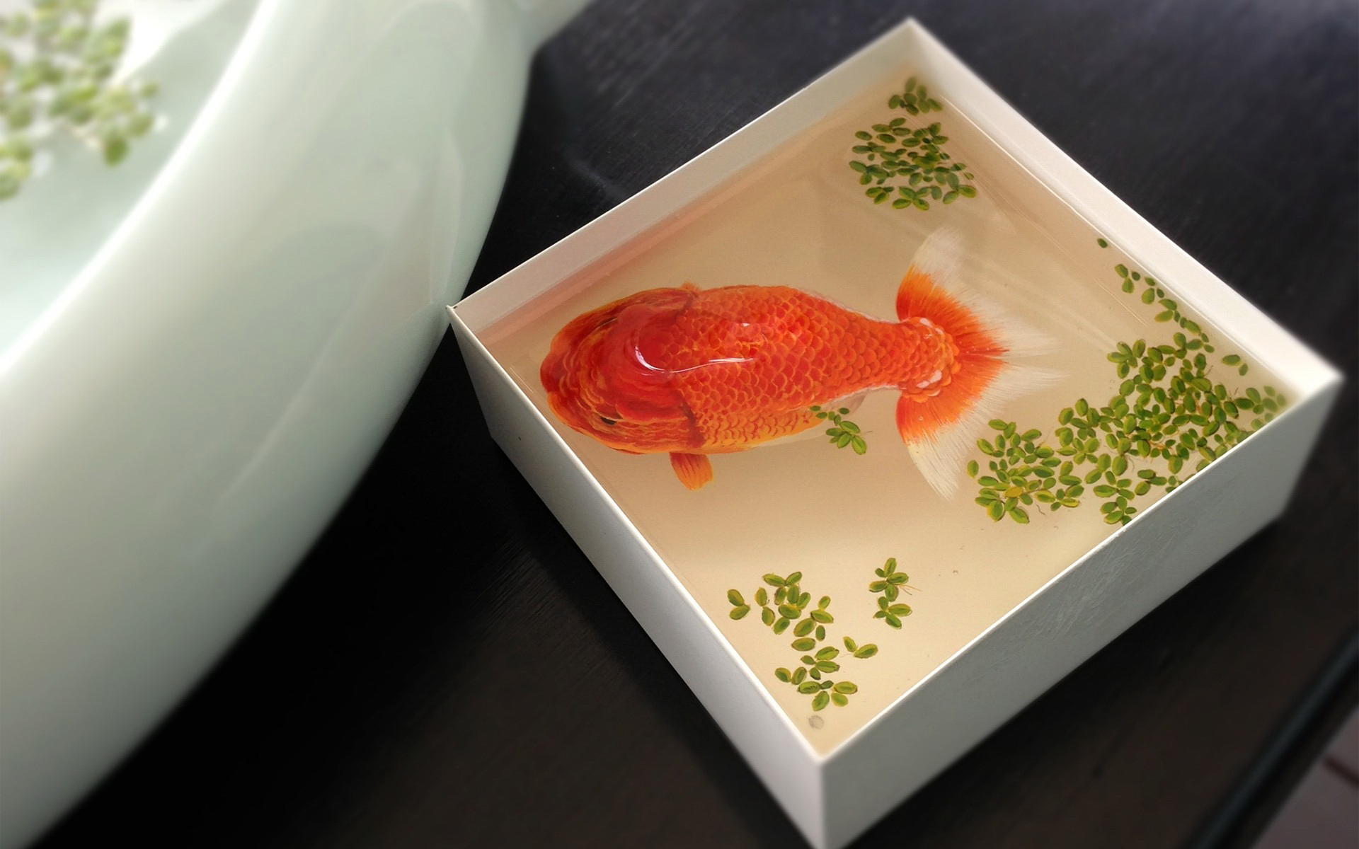 Description: A fish in a box on a table next to a bowl of peas and a bowl of broccoli.