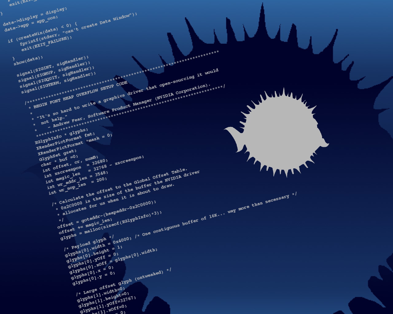 Description: A computer screen with a fish on it's side and a computer code in the background that says.