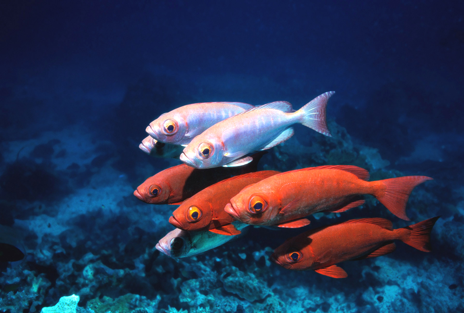 Description: A group of fish swimming on a coral reef in the ocean with blue water and corals around them.