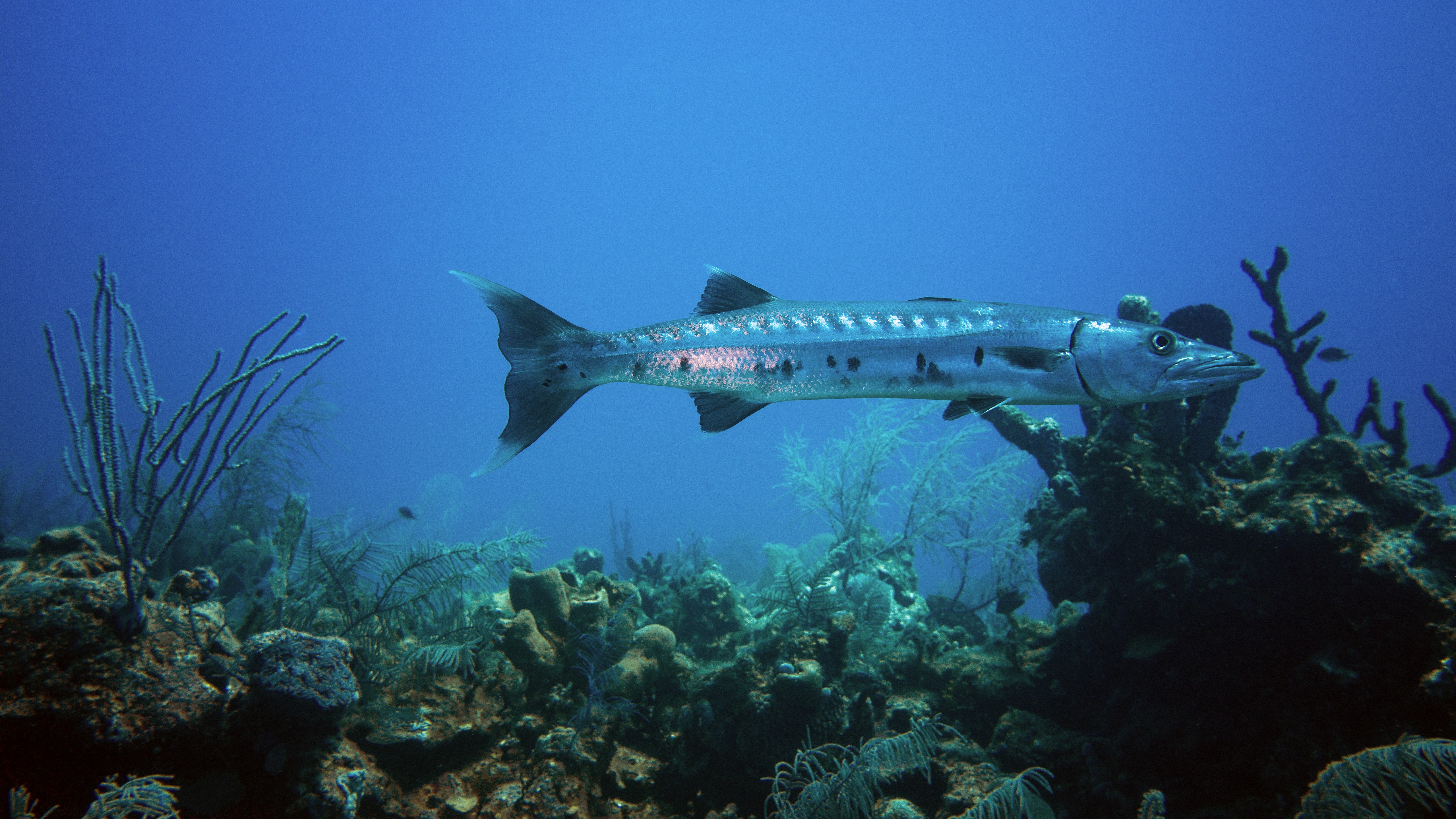 Description: A fish swimming over a coral reef with seaweed and other sea life around it on a sunny day.