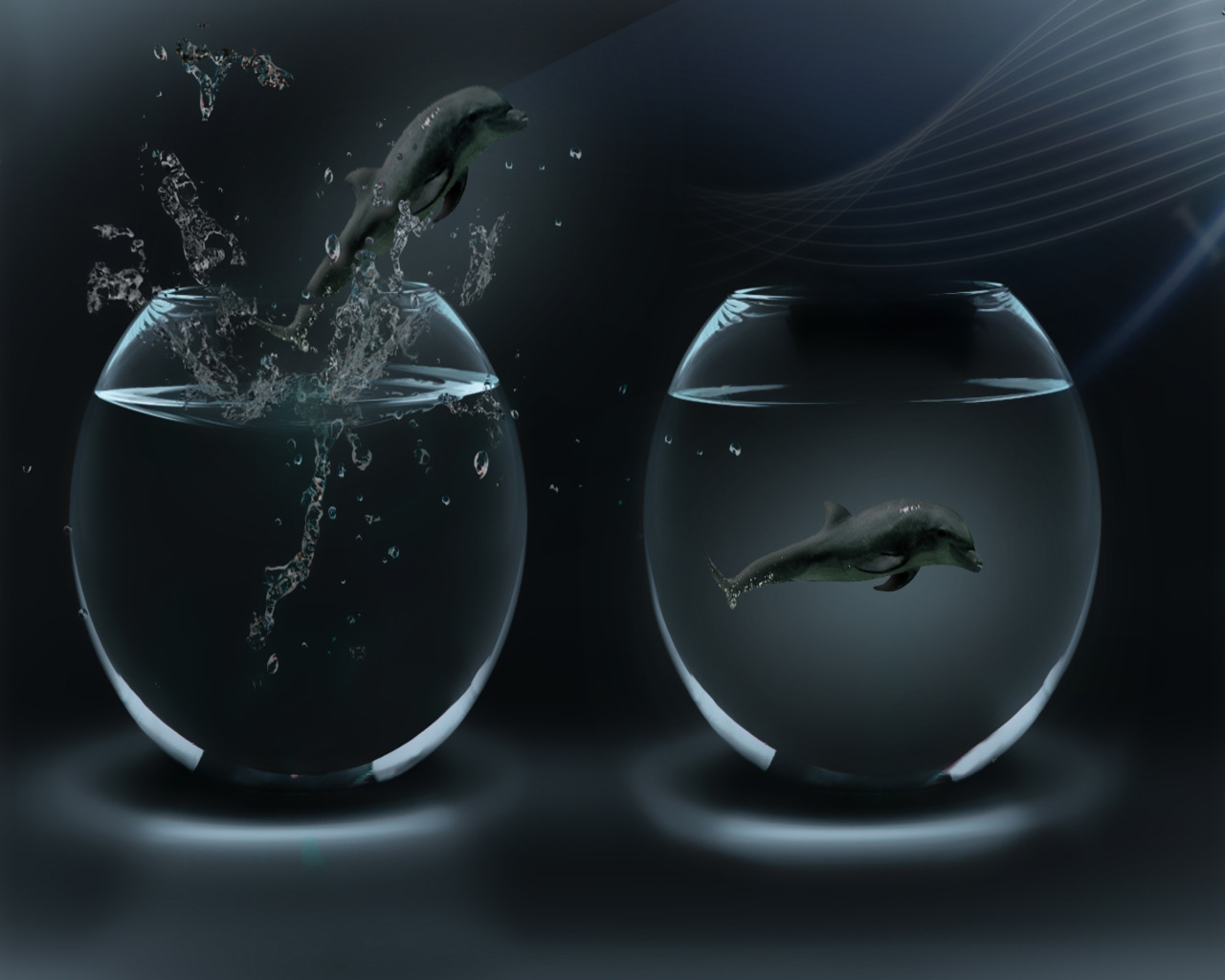 Description: A fish jumping out of a bowl of water to another fish in it's stomach.