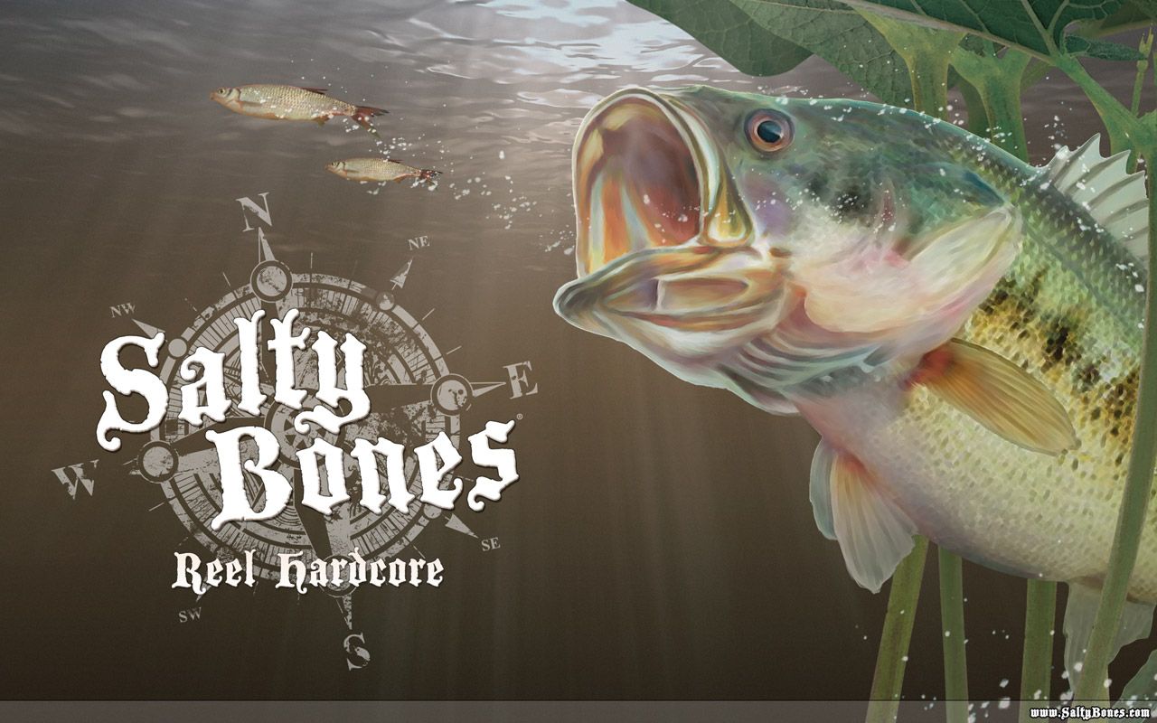 Description: A fish with its mouth open and a compass in the background with the words salty bones on it's side.