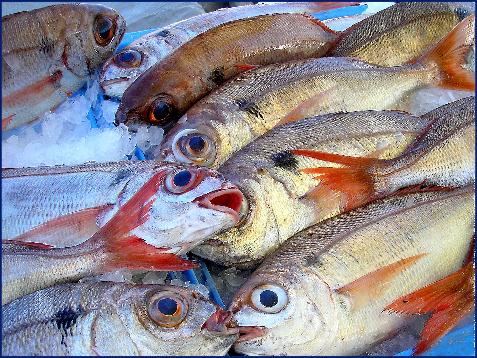 Description: A bunch of fish that are on a table together in a pile with ice on it and some of them with eyes.