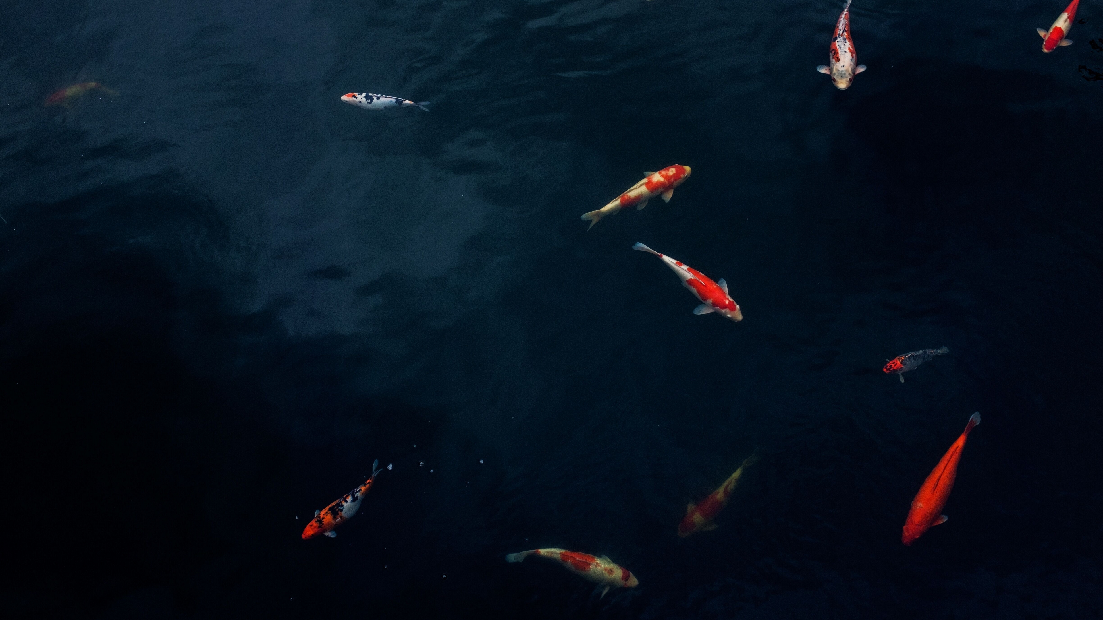 Description: A group of fish swimming in a pond of water with dark blue water and dark blue sky above them.