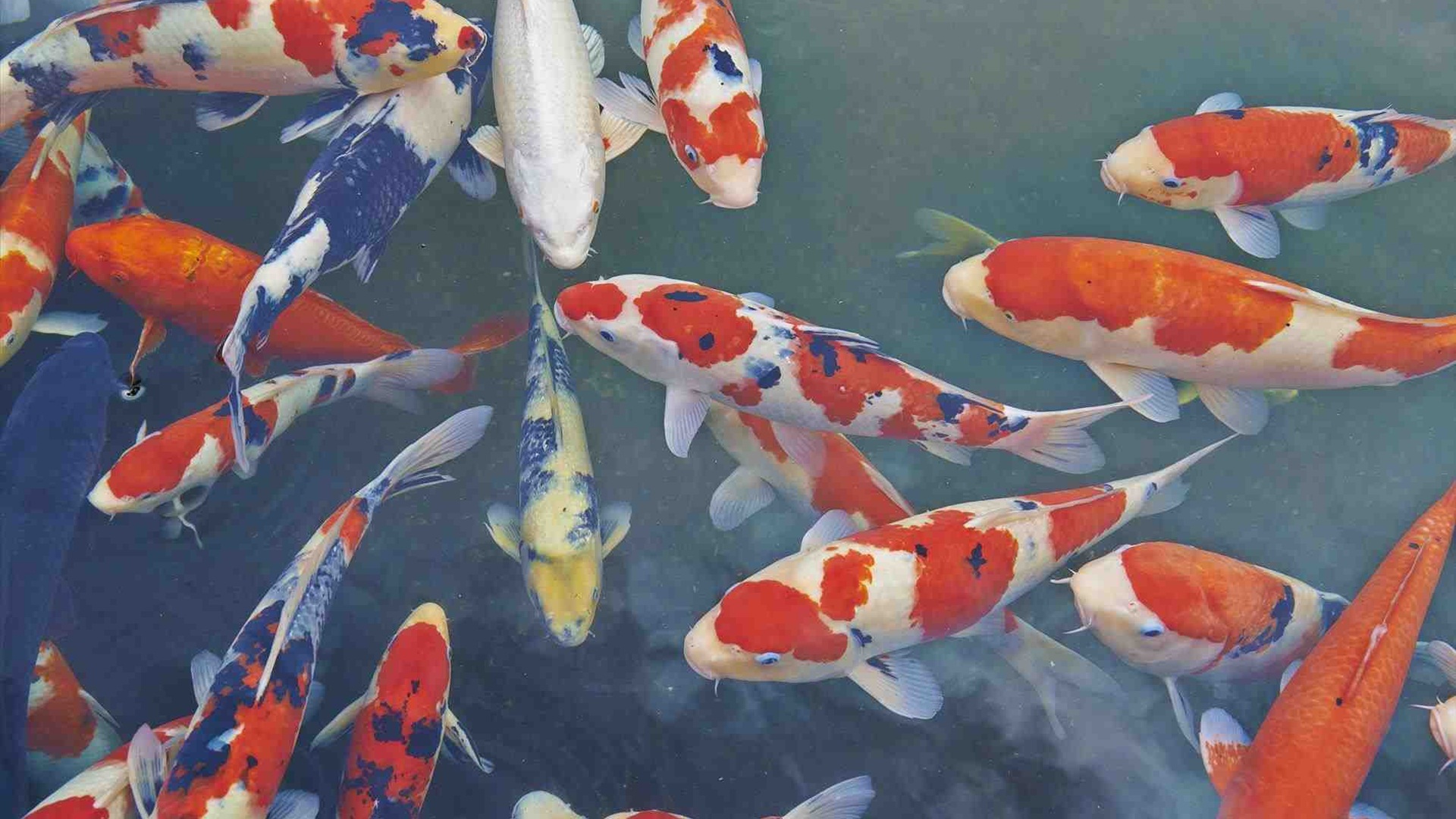Description: A group of fish swimming in a pond of water with a sky background and a few clouds in the sky.