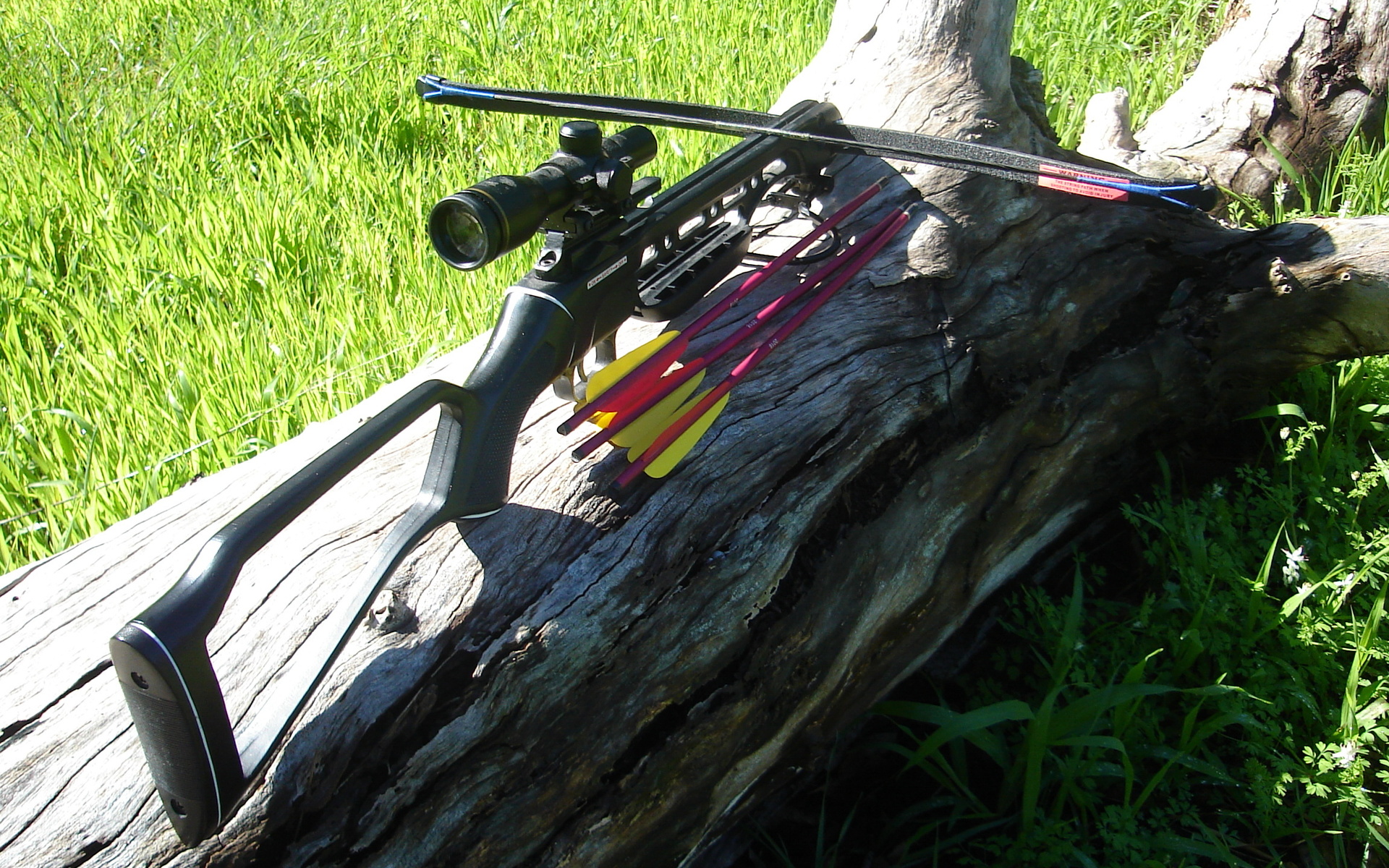 Description: A fishing rod and two fishing rods on a log in the grass near a tree trunk with a fishing pole attached to it.
