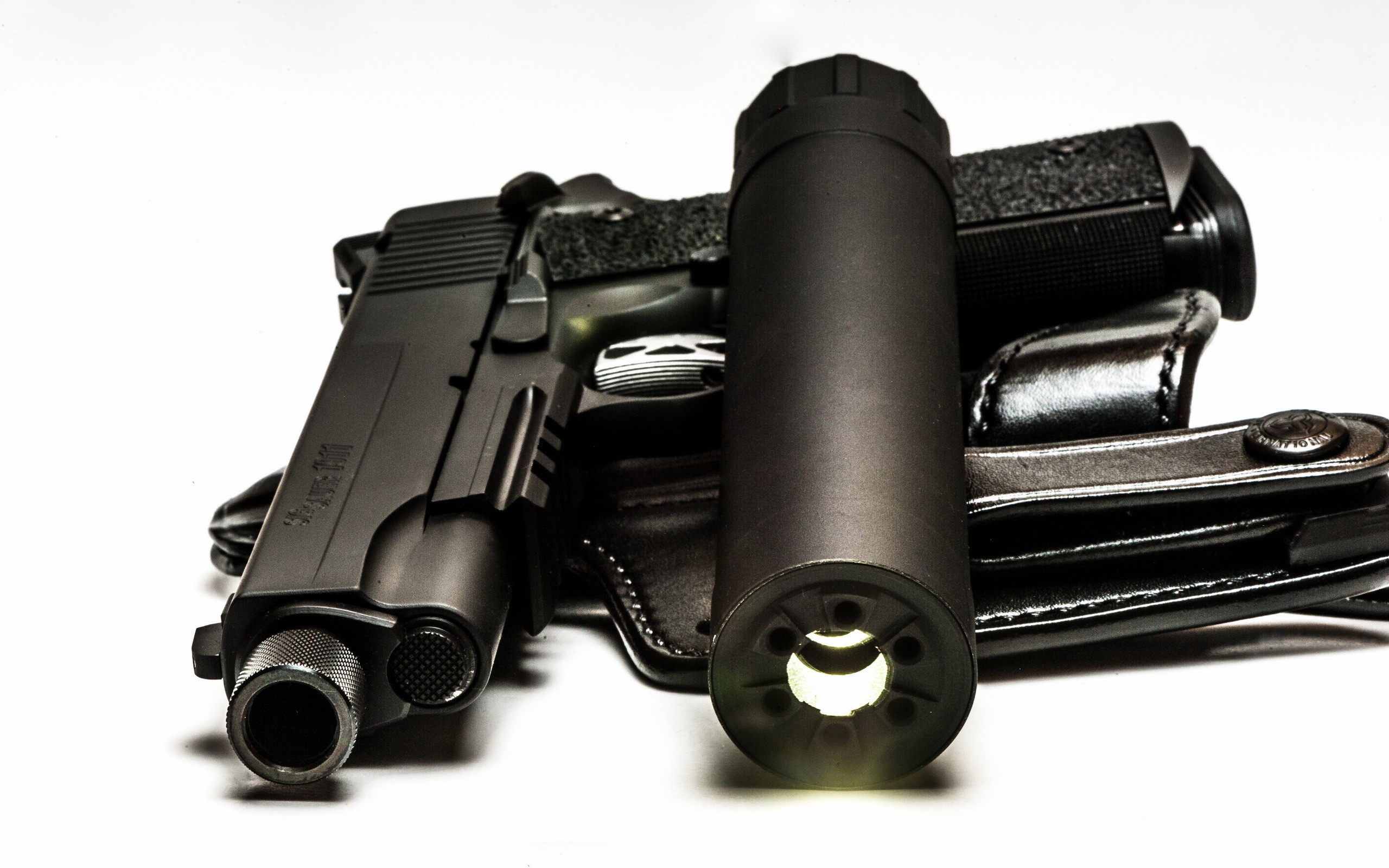 Description: A flashlight and a gun laying on a white surface with a white background and a black leather case with a black handle.