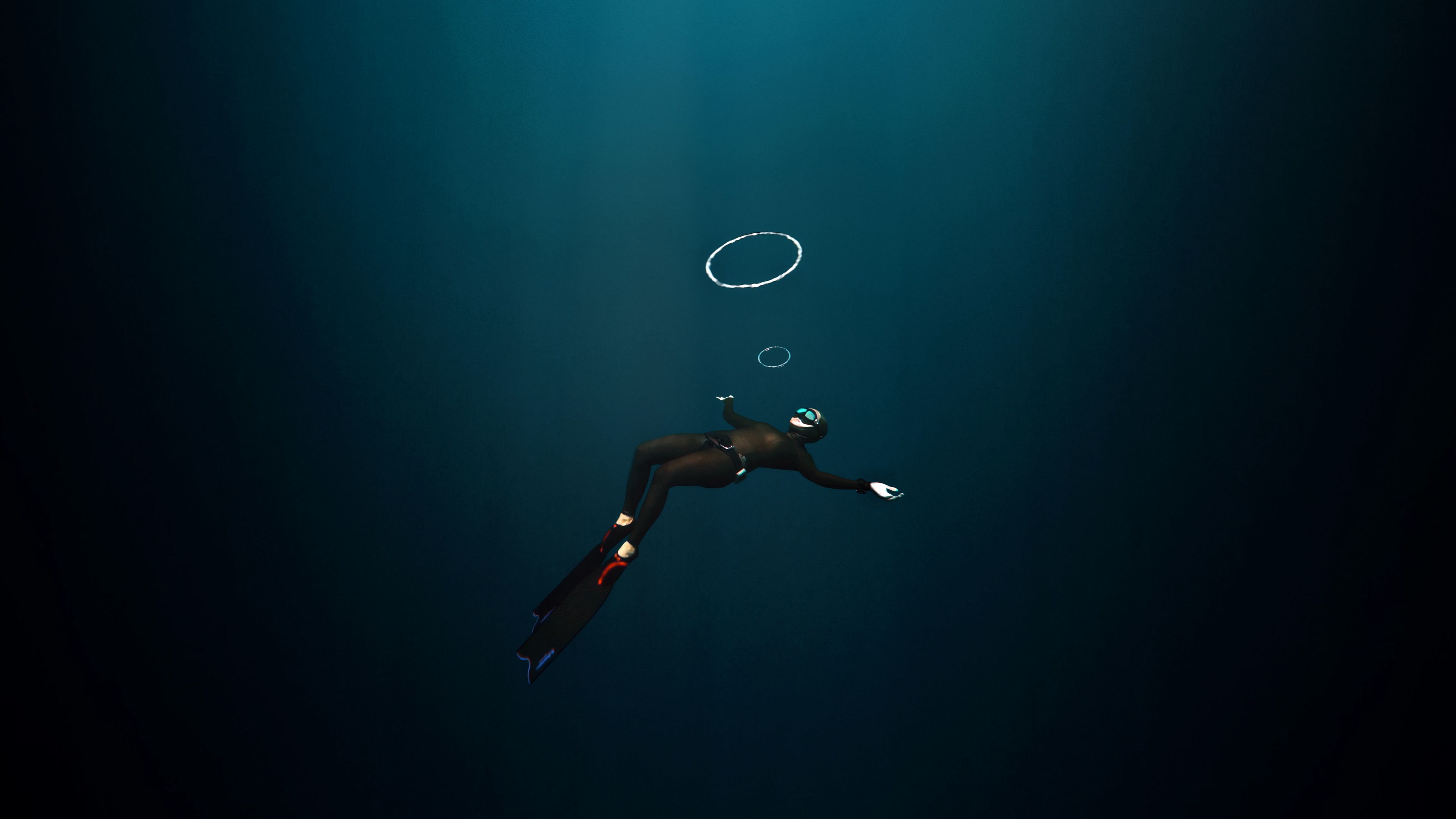 Description: A person floating in the water with a bubble above their head and a circle above their head.