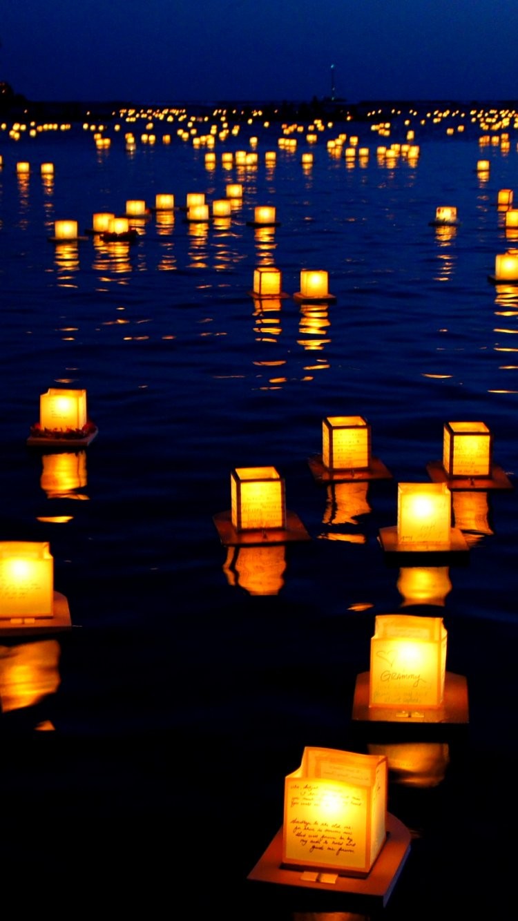 Description: A number of floating lanterns in the water at night time with lights on them and a sky background with a few clouds.
