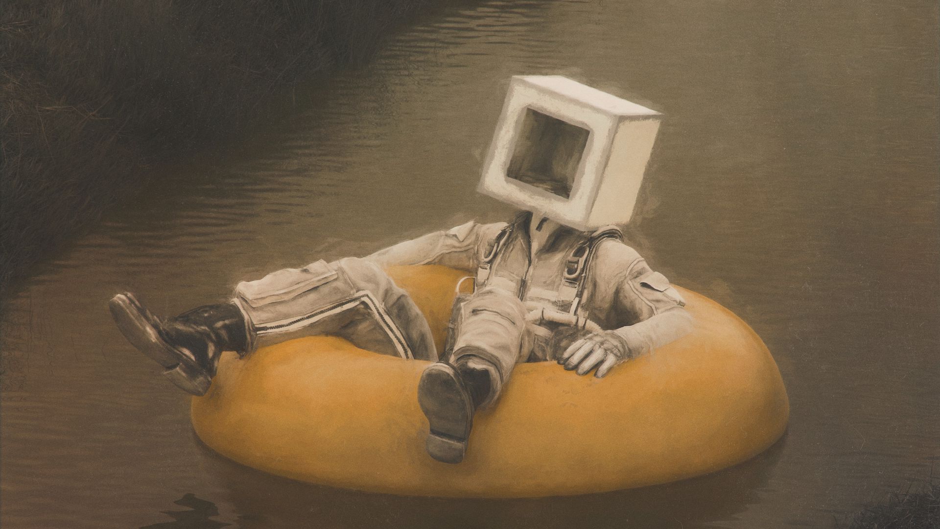 Description: A painting of a man floating on a floating device in a river with a tv on his head and a computer monitor on his head.