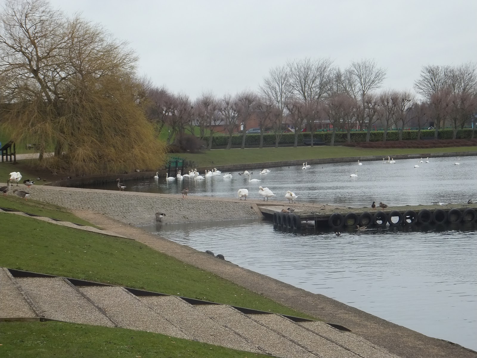 Description: A flock of birds sitting on top of a lake next to a park bench and a walkway near a lake.