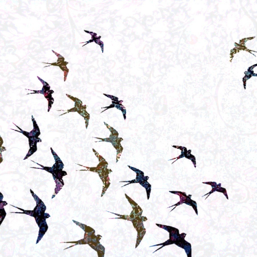 Description: A flock of birds flying through the sky together in formation in a pattern of birds in flight.