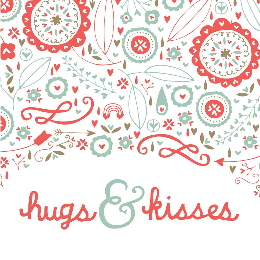 Description: A card with a floral design and the words hugs and kisses on it in red and blue colors.