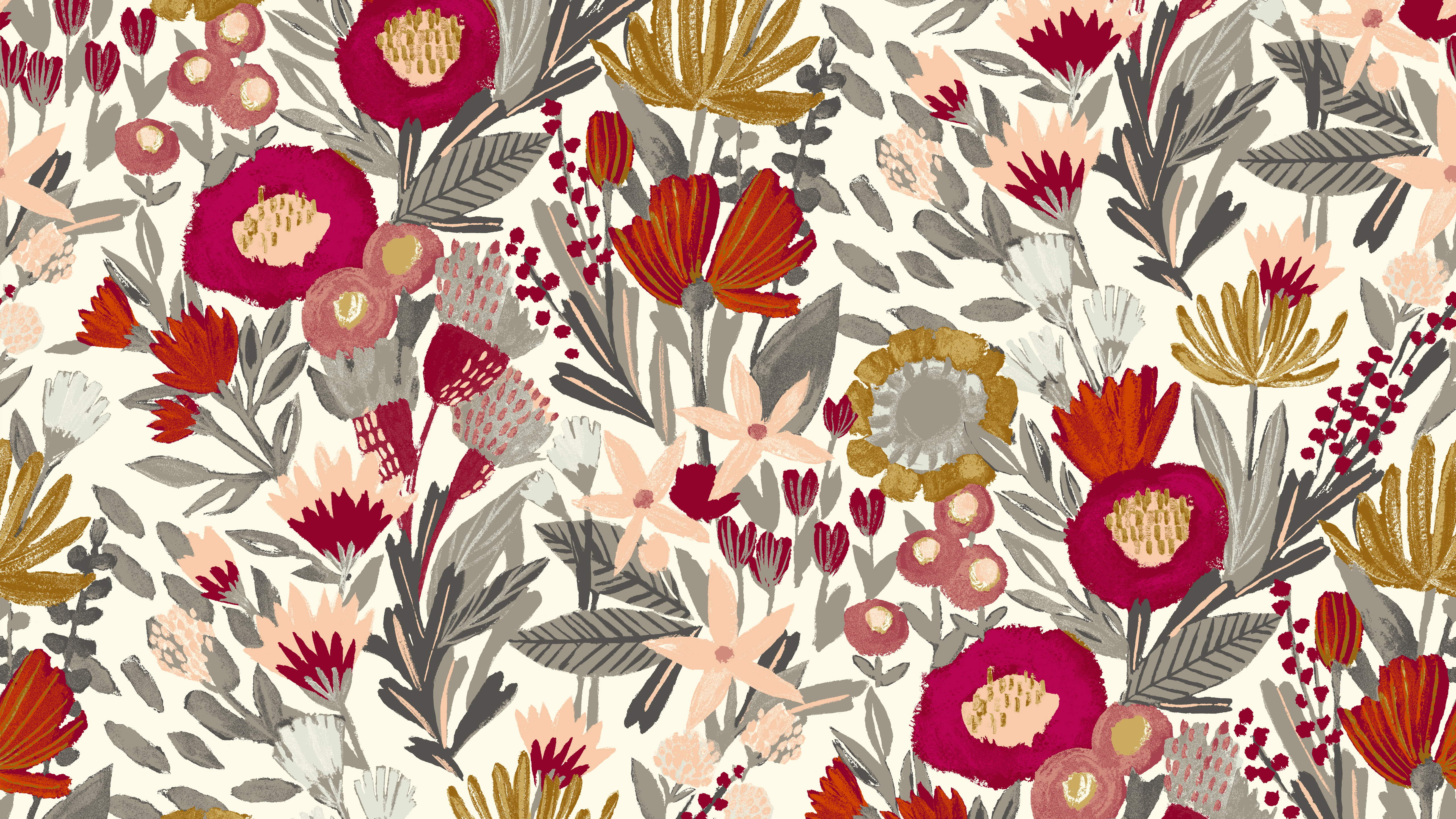 Description: A floral pattern with many different colors and sizes of flowers on a white background with a gold and red border.