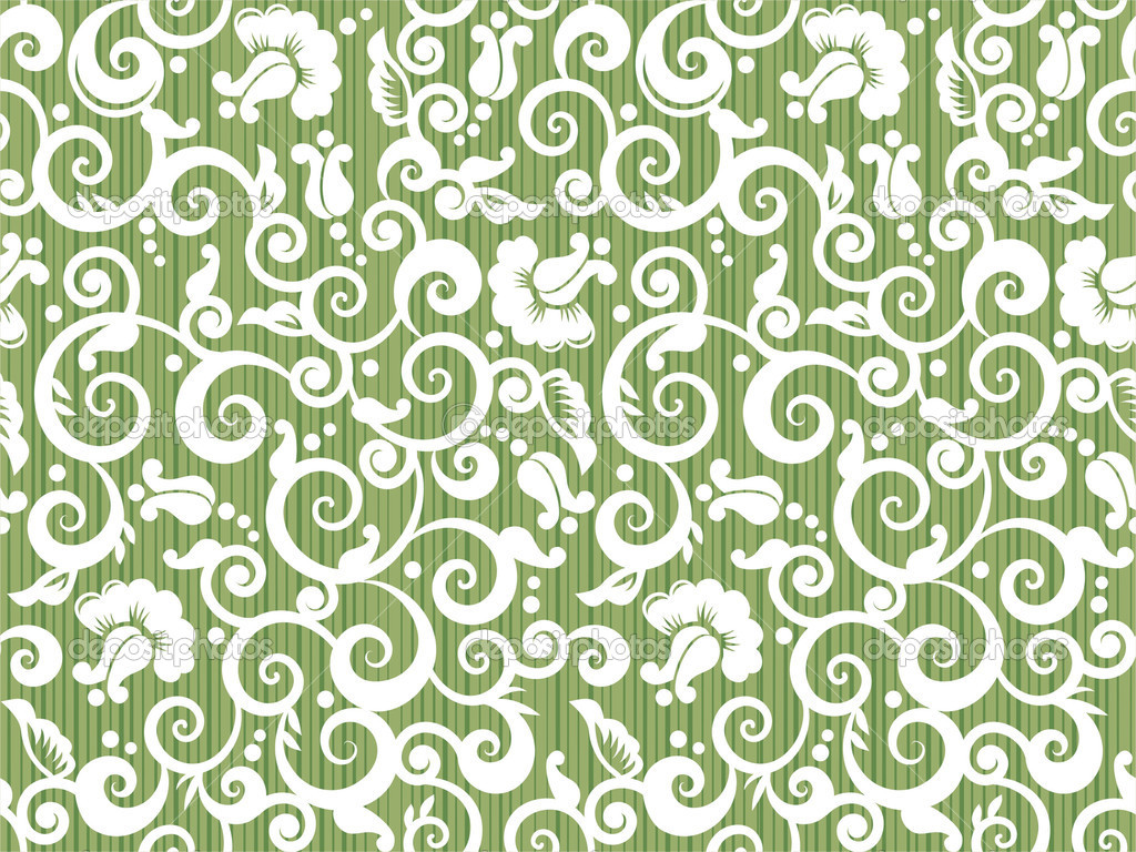Description: A green and white floral pattern with swirls and leaves on a striped background royalty photo - art illustration.