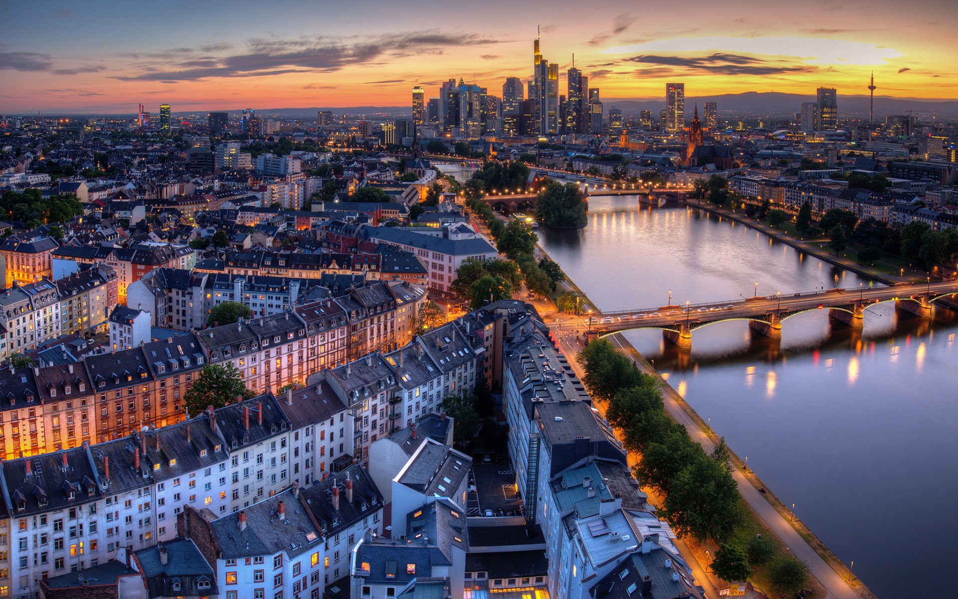 Description: A city with a bridge and a river in the middle of it at sunset or dawn with a city in the background.