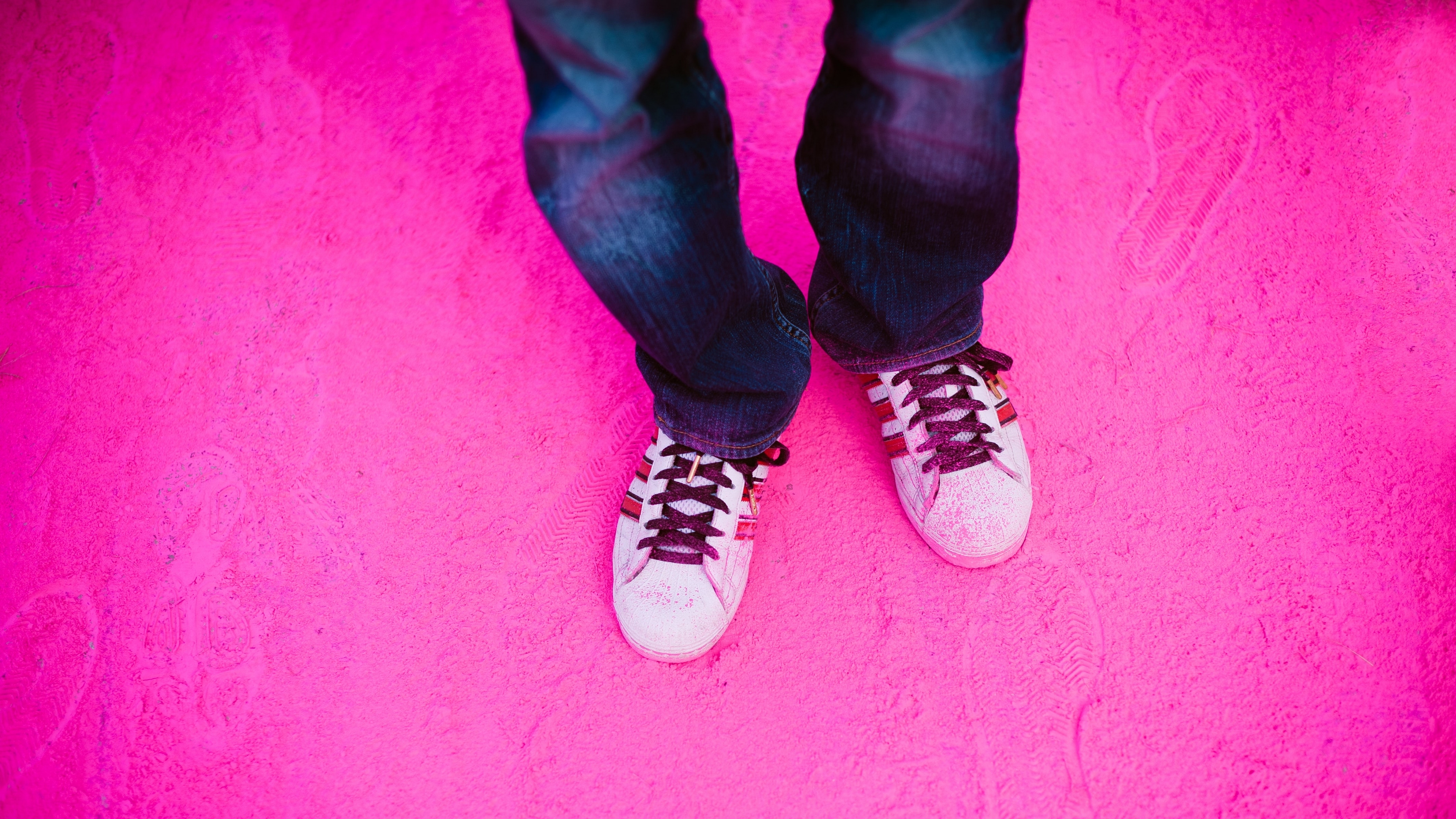Description: A person standing on a pink carpet with white shoes on it's feet and a pink background behind them.