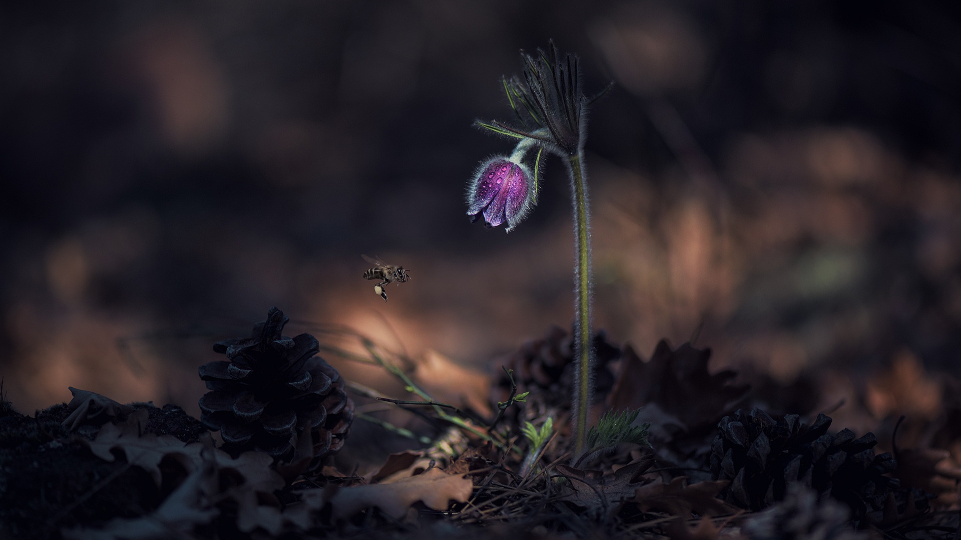 Description: A flower with a bee flying by it on a dark background with leaves and grass in the foreground.