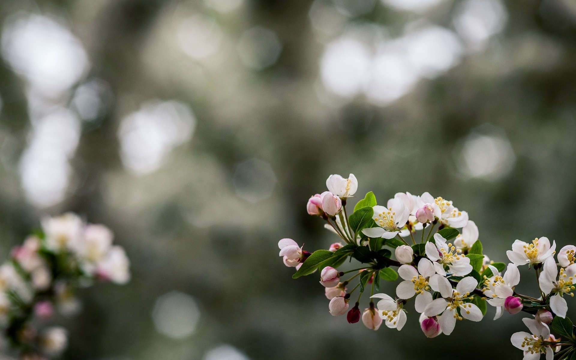 Description: A branch of a flowering tree with white and pink flowers and green leaves in the background of a blurry forest.