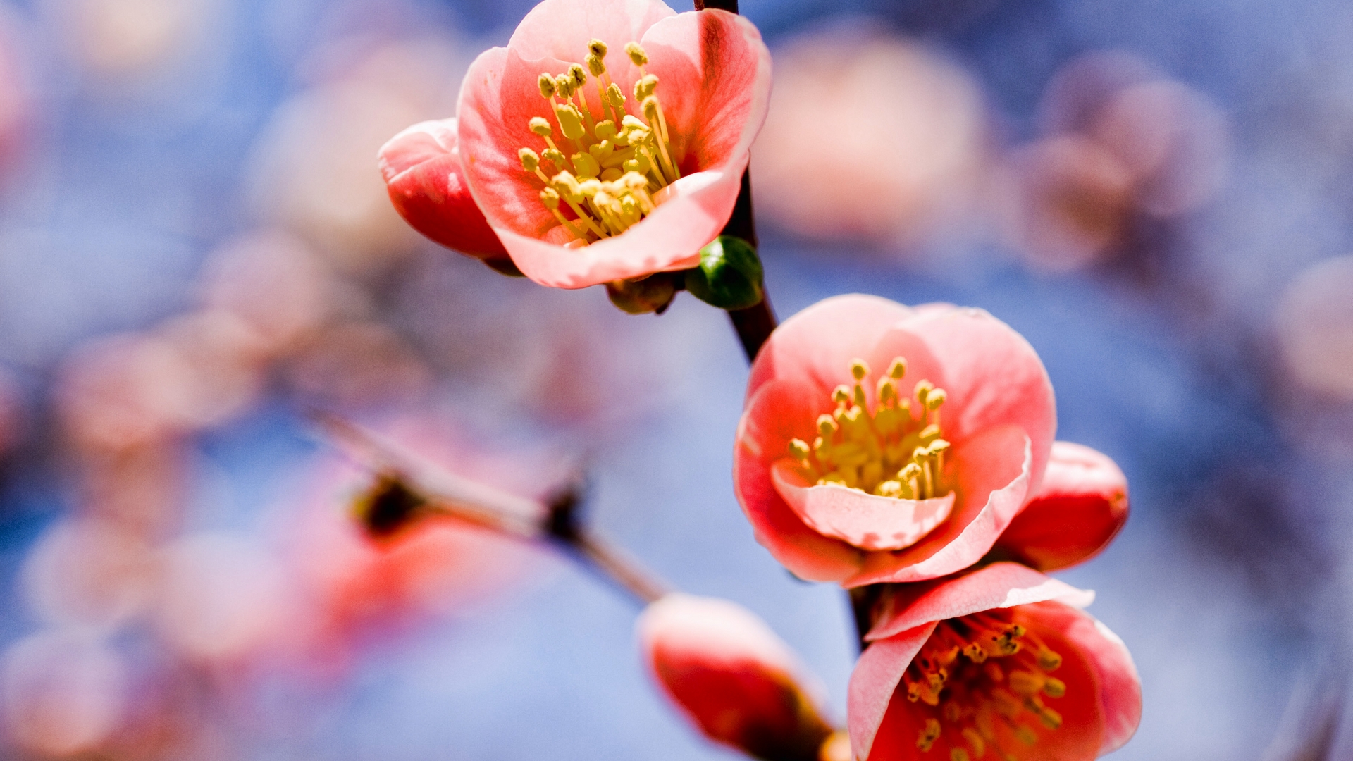 Description: A close up of a flower on a tree branch with a blue sky in the background and a few leaves.