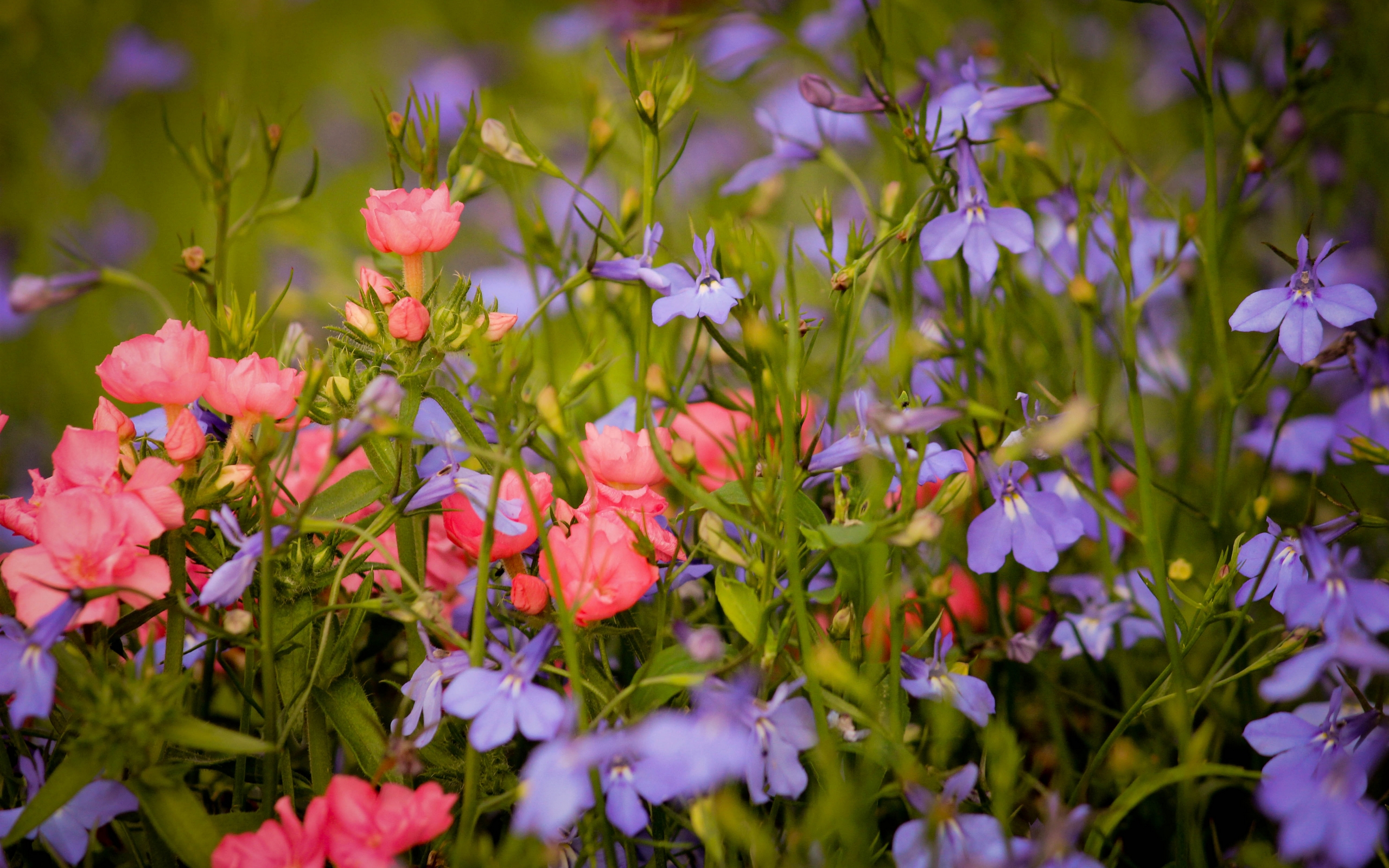 Description: A bunch of flowers that are in the grass together and some pink and blue flowers in the background and a green grass.