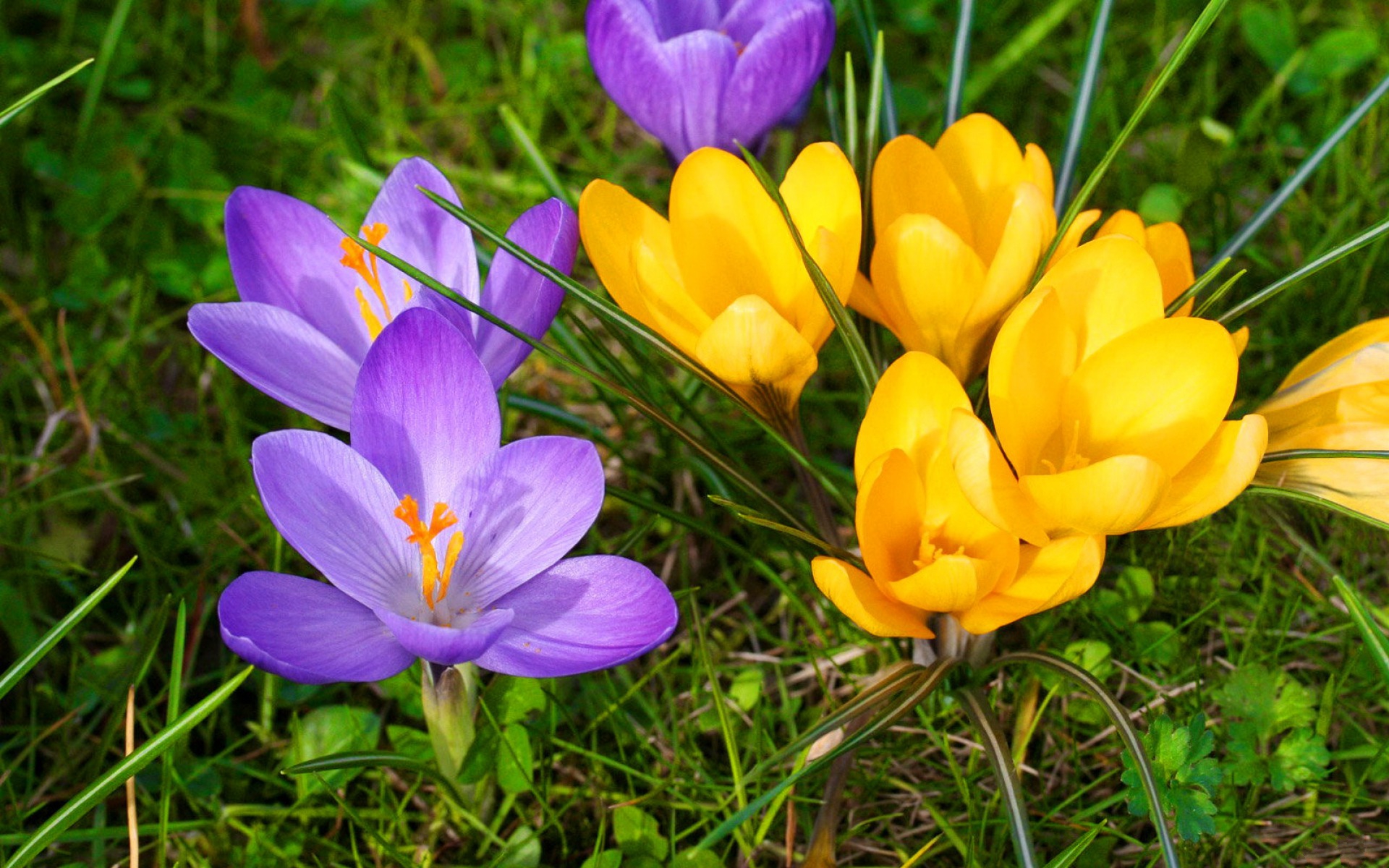 Description: A group of flowers that are in the grass together on the ground with grass and flowers in the background.