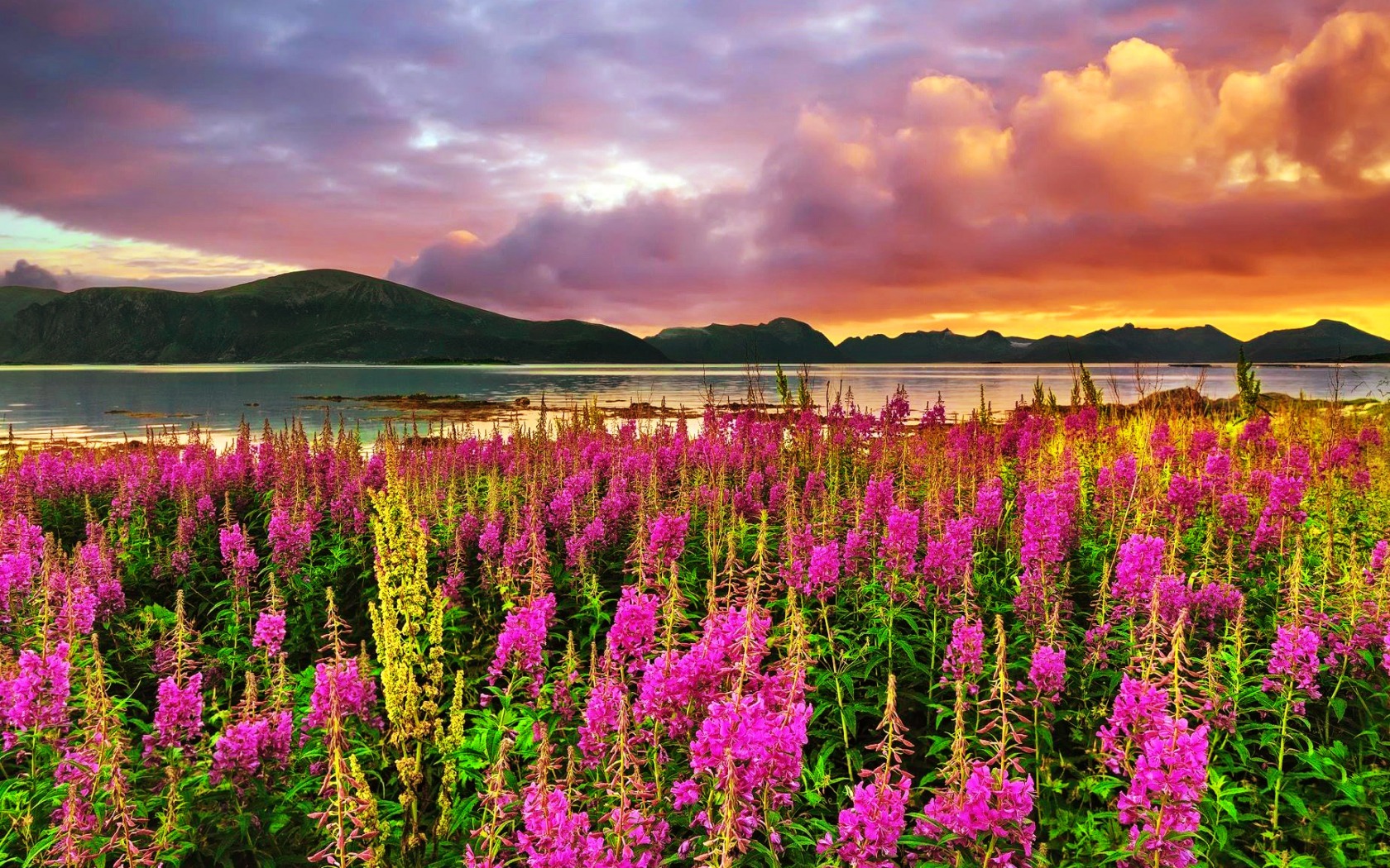 Description: A field of flowers with a lake in the background at sunset with clouds in the sky and mountains in the distance.