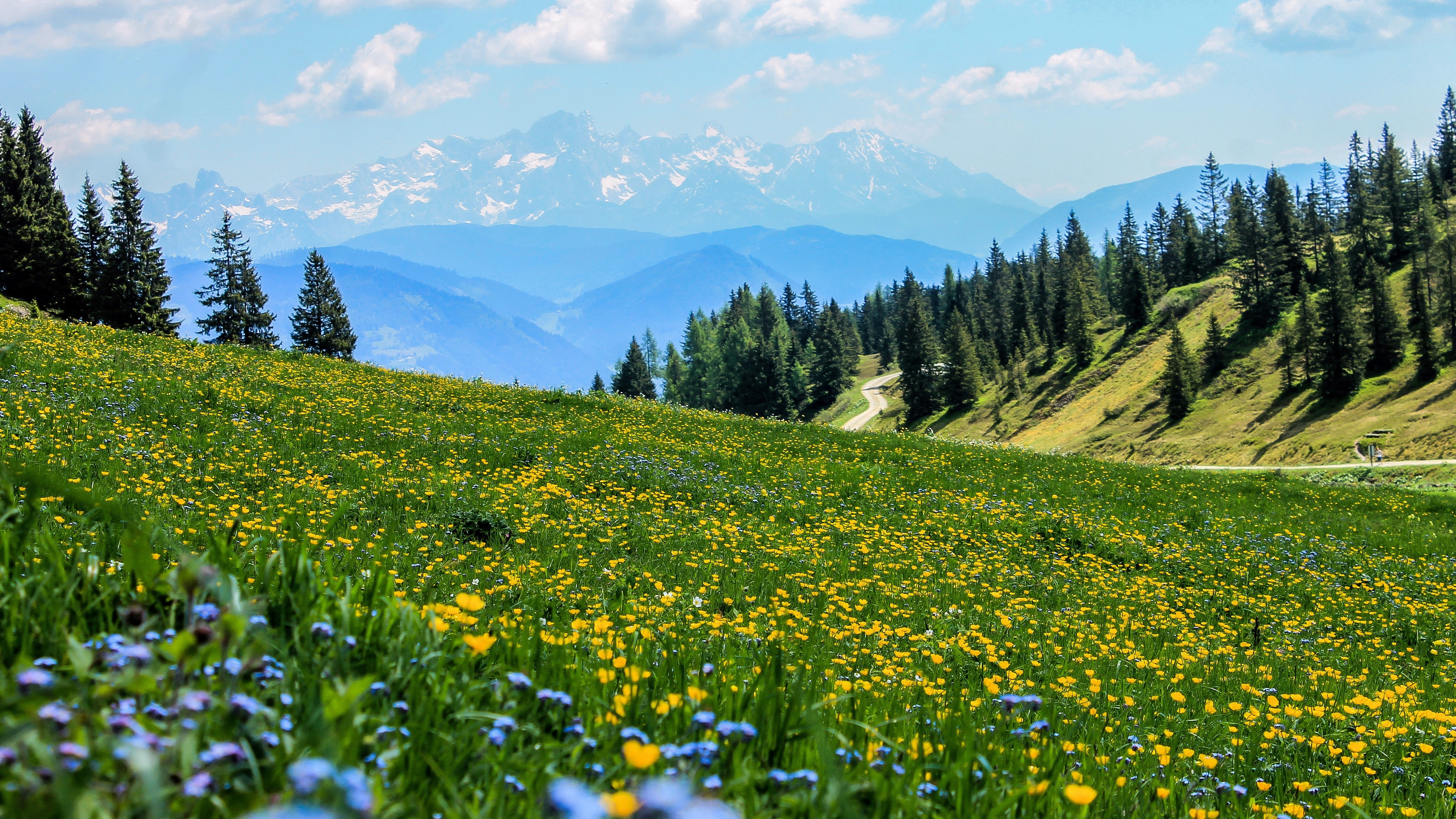 Description: A field of flowers and trees with mountains in the background and a blue sky with clouds in the distance.