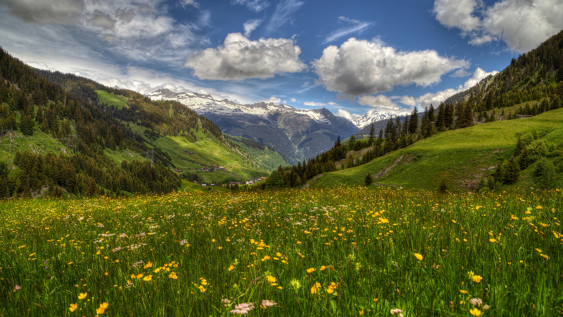 Description: A field of flowers and trees with mountains in the background and clouds in the sky above it.