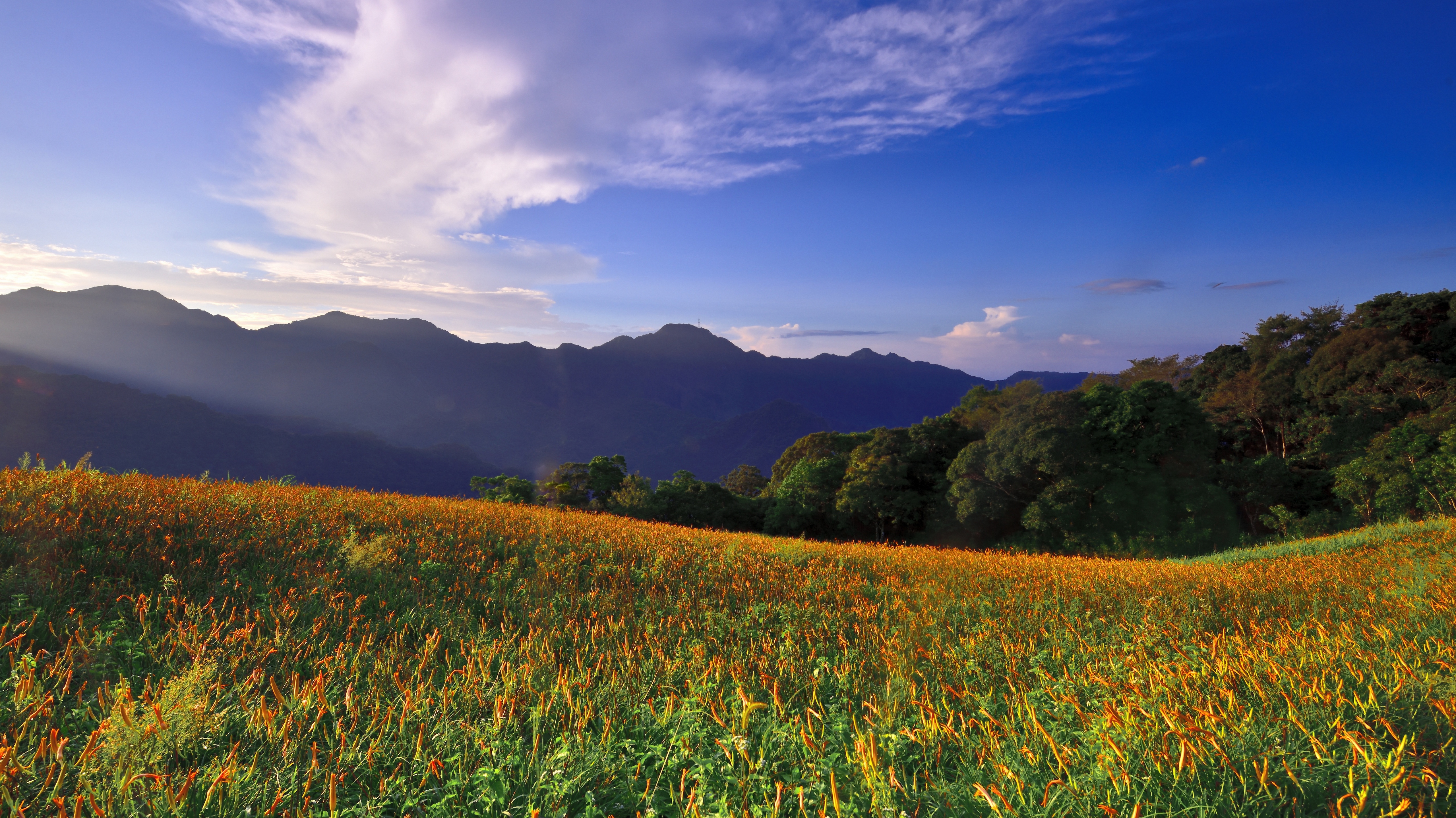 Description: A field of flowers with mountains in the background and a blue sky with clouds above it and a sunbeam.