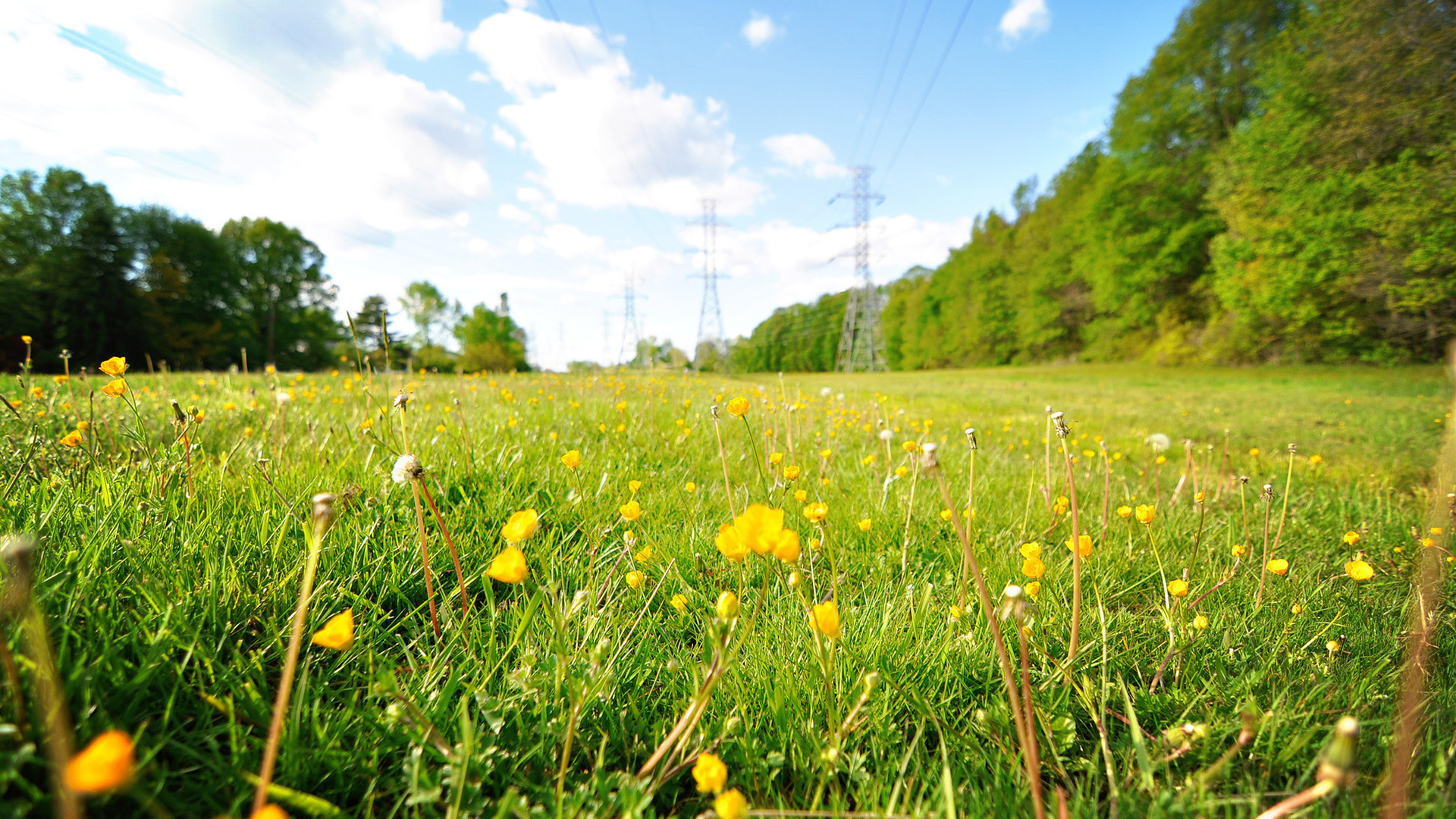 Description: A field of flowers and grass with power lines in the background and a blue sky with clouds above it.