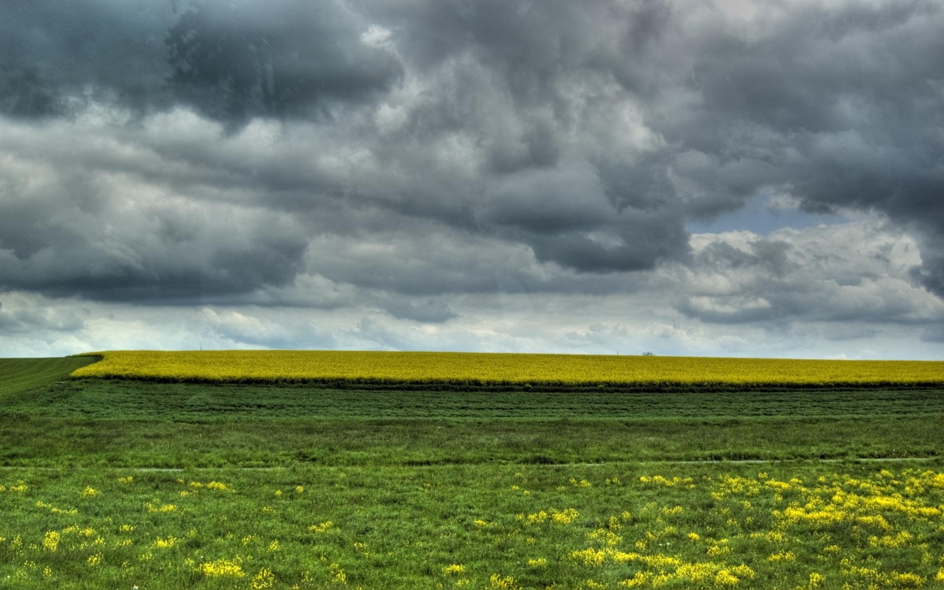 Description: A field with a few yellow flowers under a cloudy sky with dark clouds above it and a lone tree in the distance.
