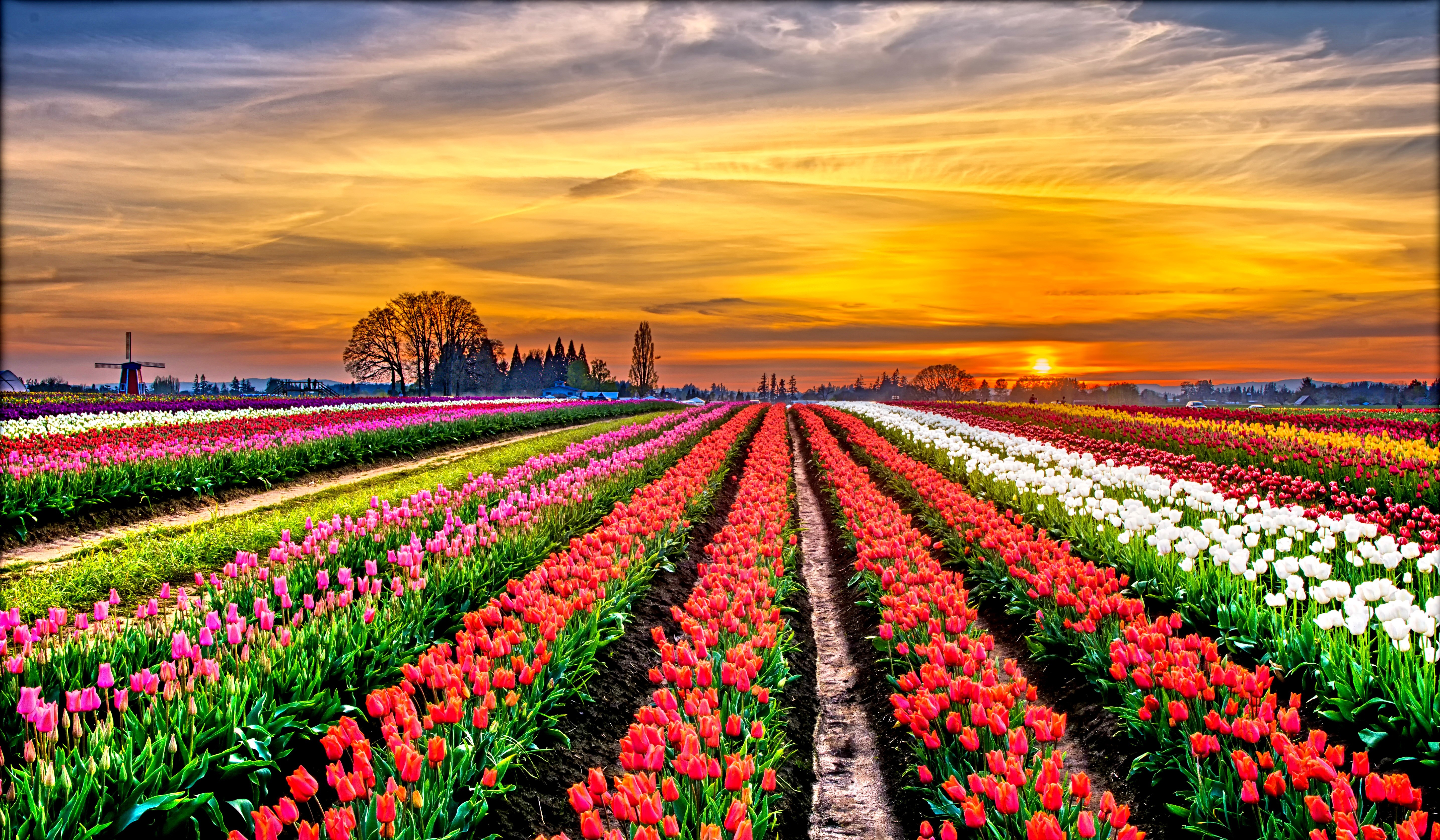 Description: A field of flowers with a sunset in the background and a sky filled with clouds above it with a few clouds.