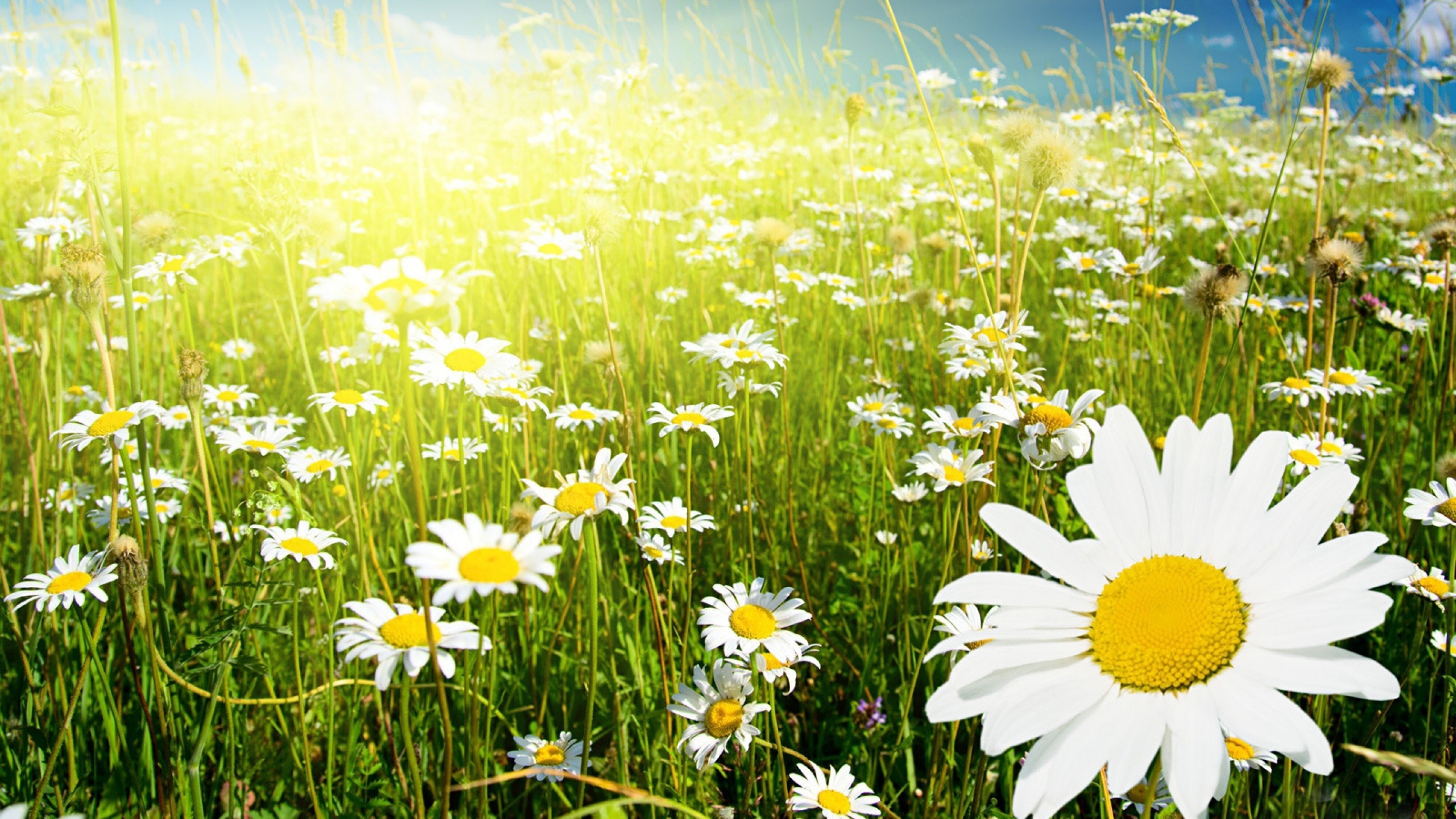 Description: A field of daisies and other flowers with the sun shining through the clouds in the background.