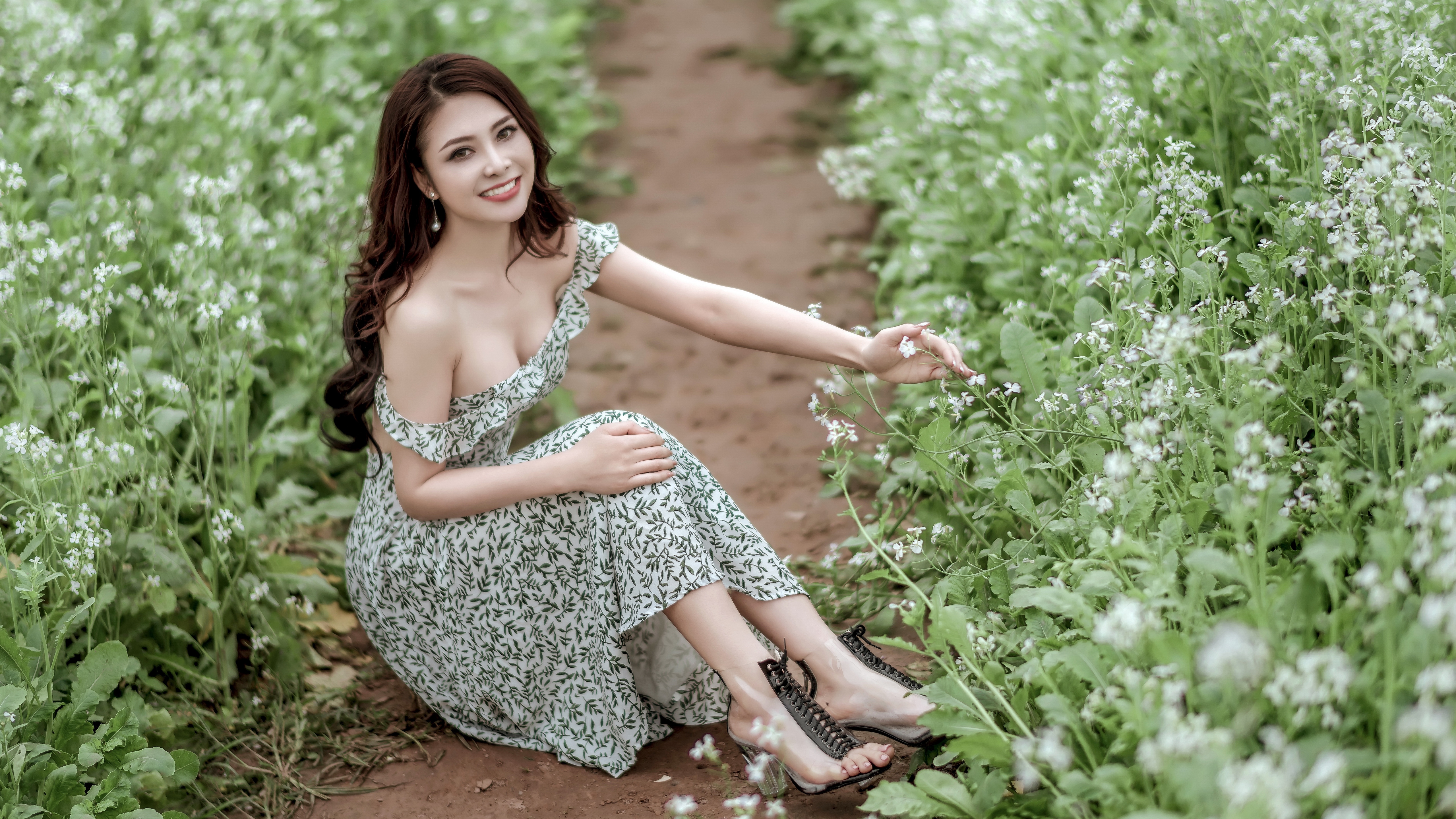 Description: A woman sitting in a field of flowers with her legs crossed and her hand on her hippie.