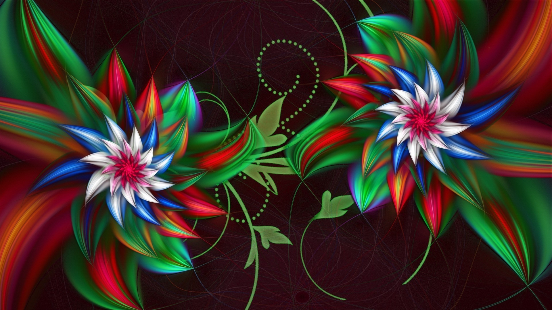 Description: A computer generated image of a flower with a red background and green leaves and swirls and a red background.