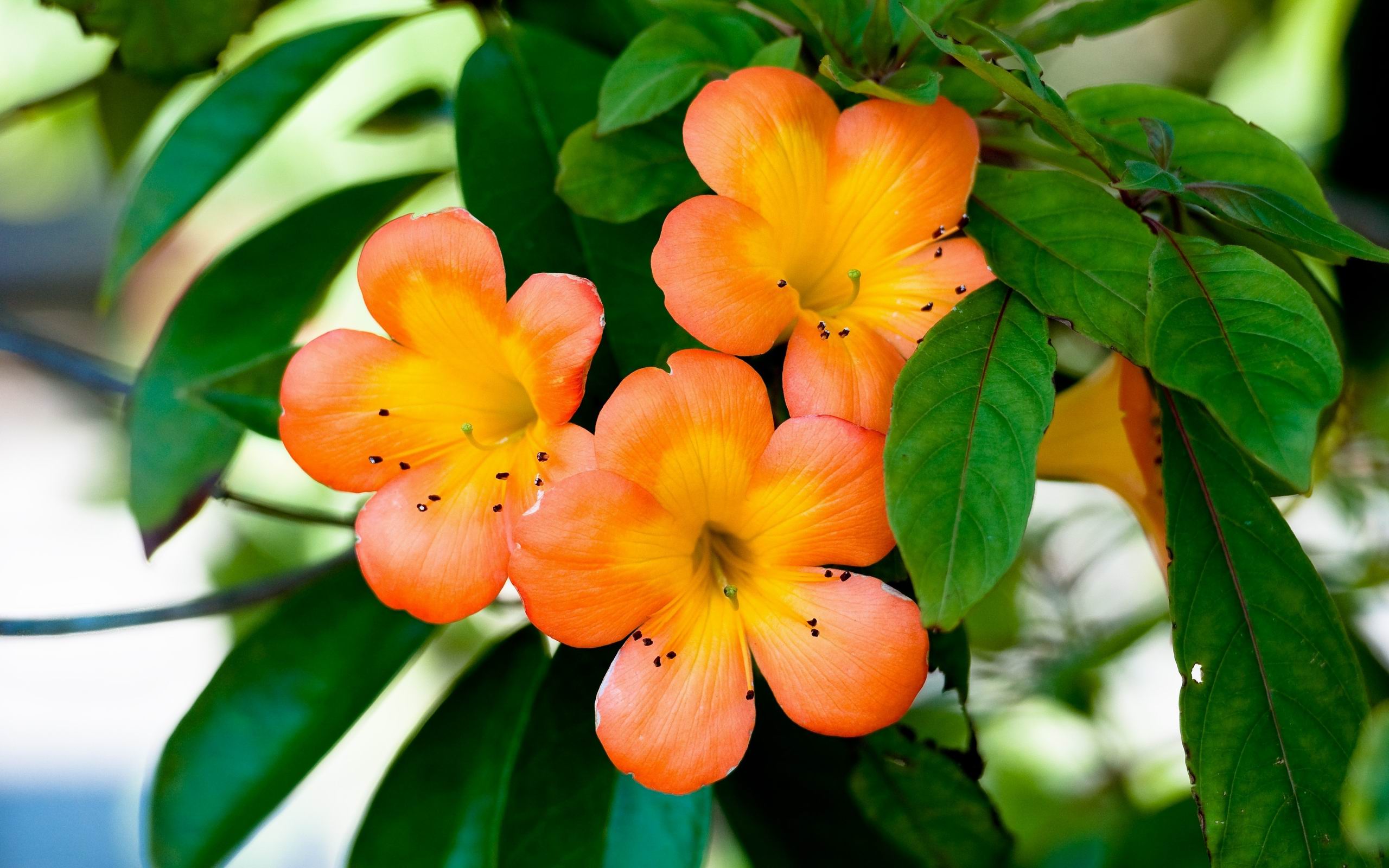 Description: A close up of a flower on a tree branch with leaves in the background and a blurry background.