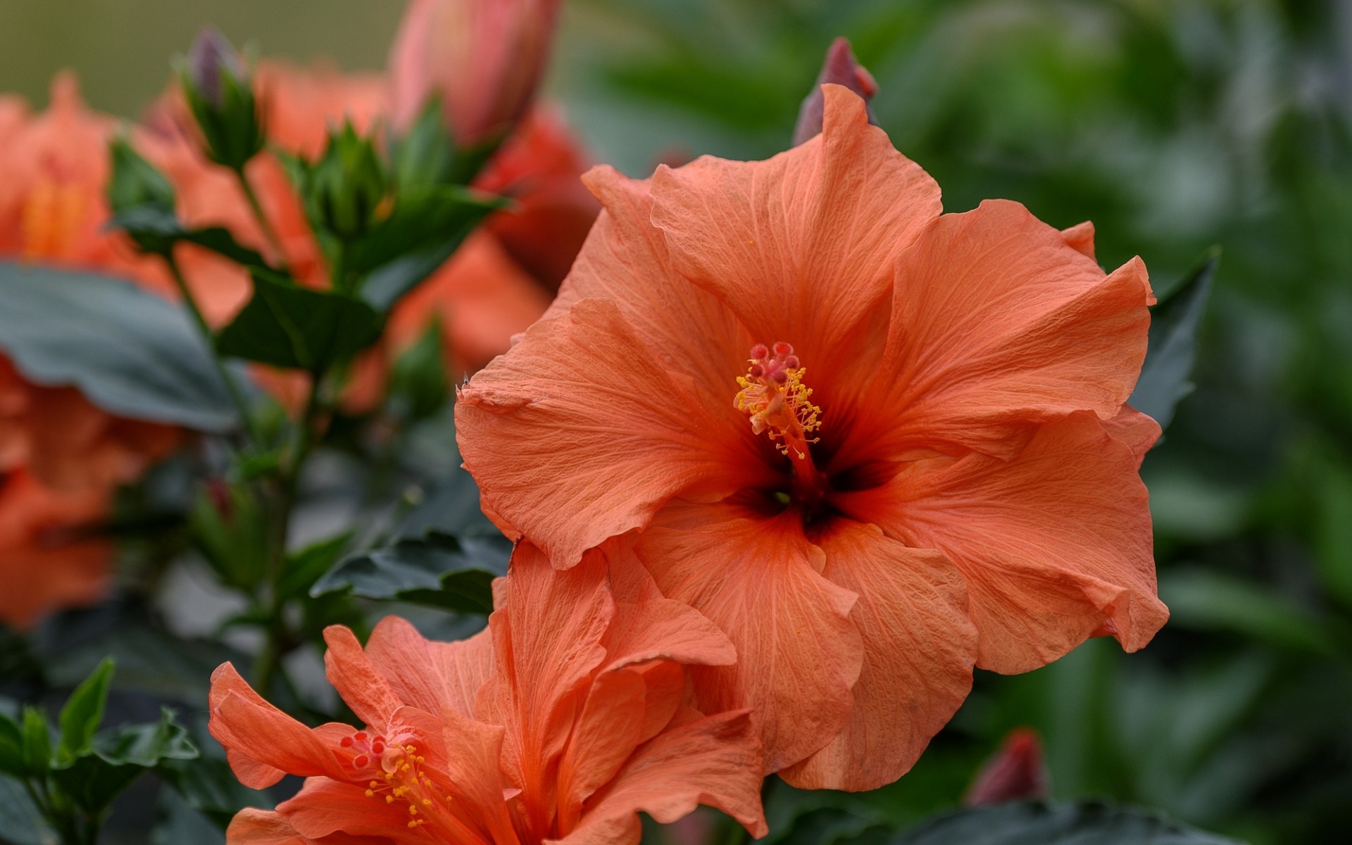 Description: A close up of a flower with many leaves around it and a few flowers in the background with a blurry background.