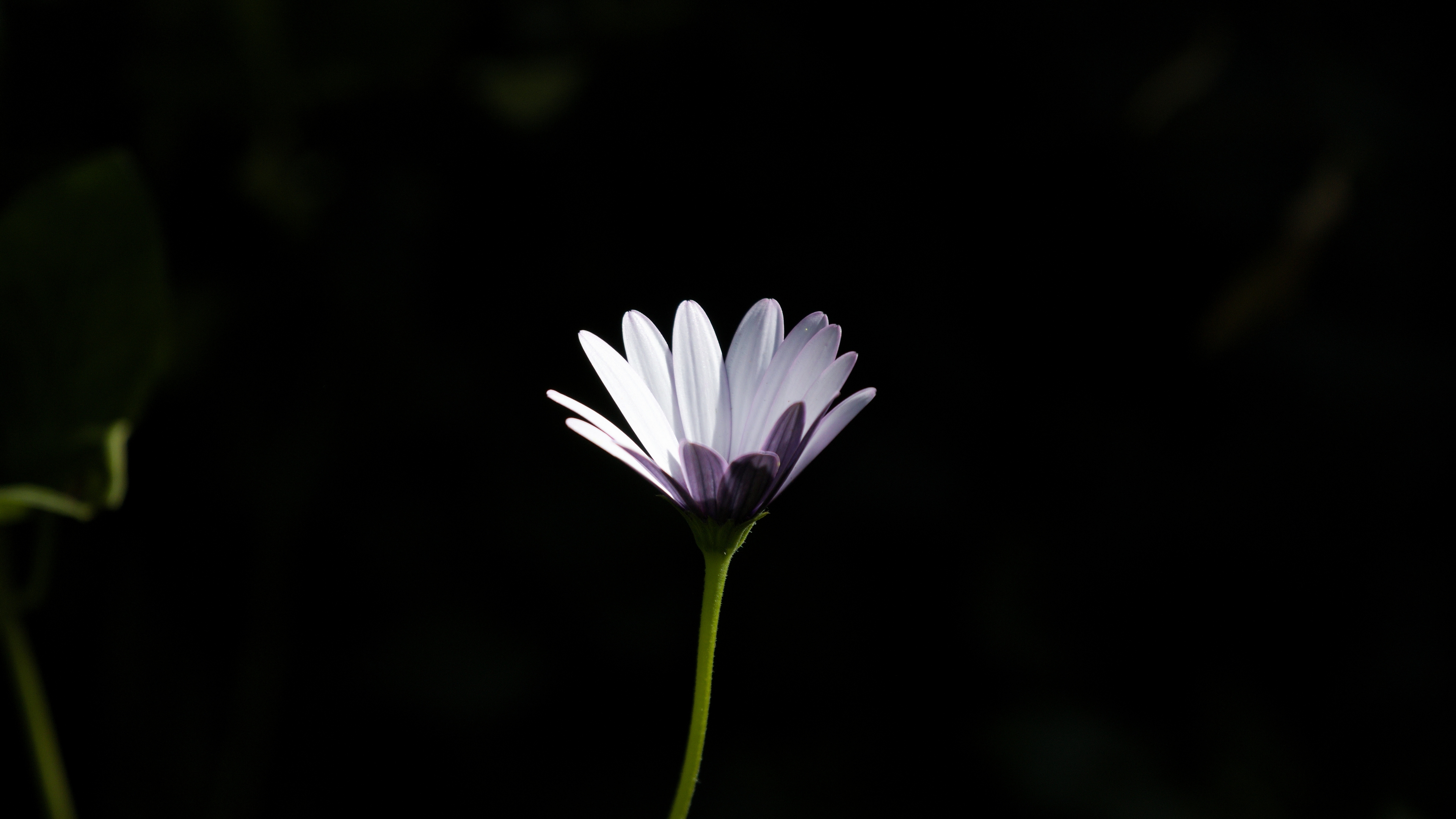 Description: A single flower is shown in the dark with a black background behind it and a green stem in the foreground.