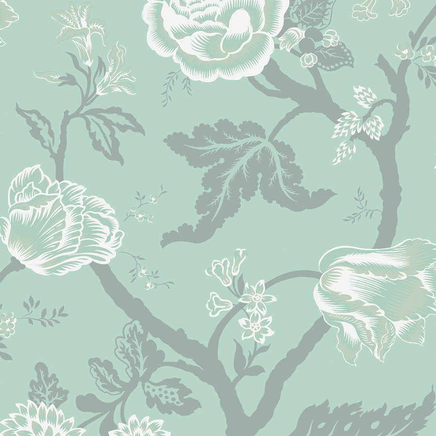 Description: A wallpaper with a flower pattern on it in a room with a green wall and a blue wall.