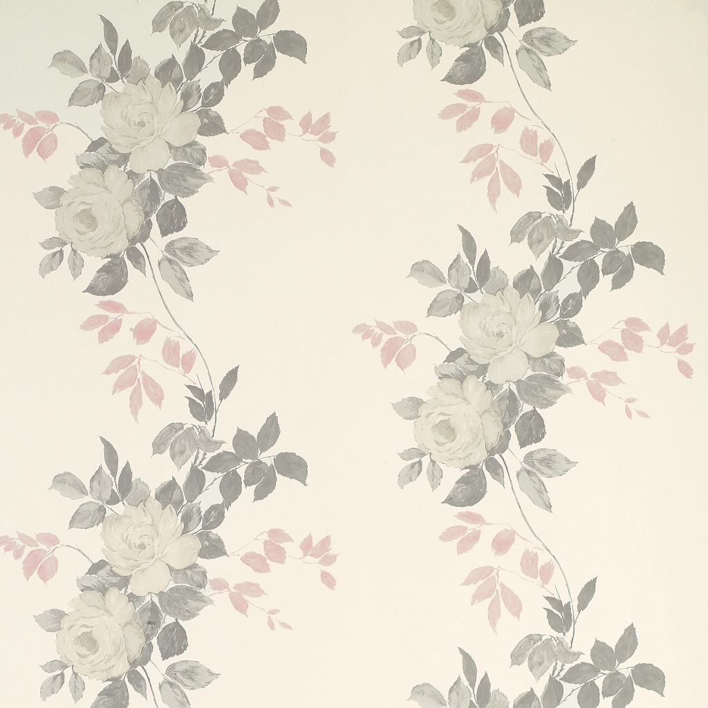 Description: A wallpaper with a flower pattern on it and a white background with grey and pink flowers on it.