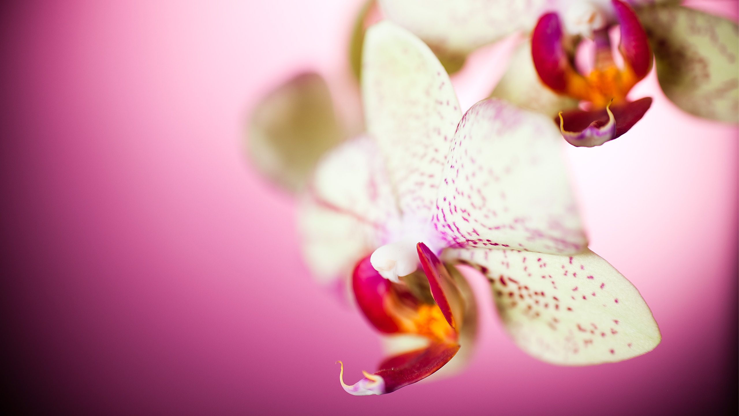 Description: A close up of a flower with a pink background behind it and a pink background behind it with a white and red flower.