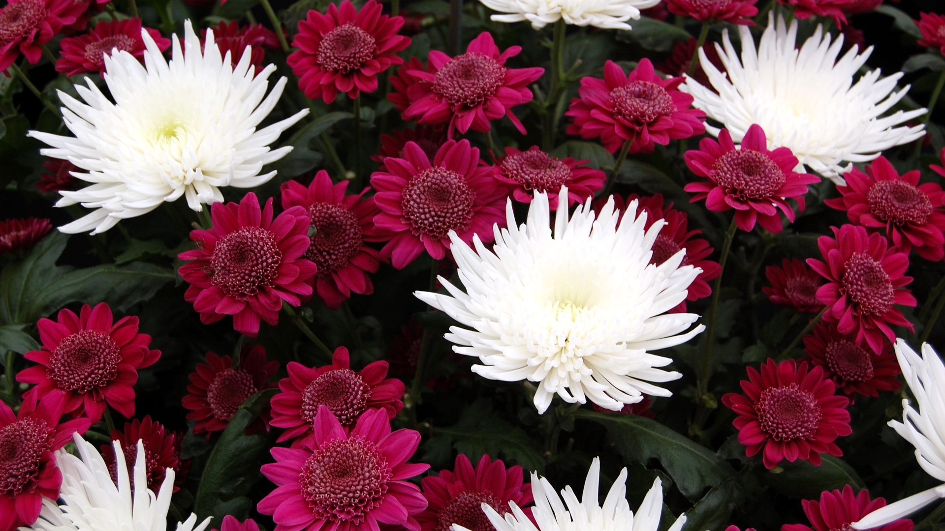 Description: A bunch of white and red flowers with green leaves in the background and a red and white flower in the middle.
