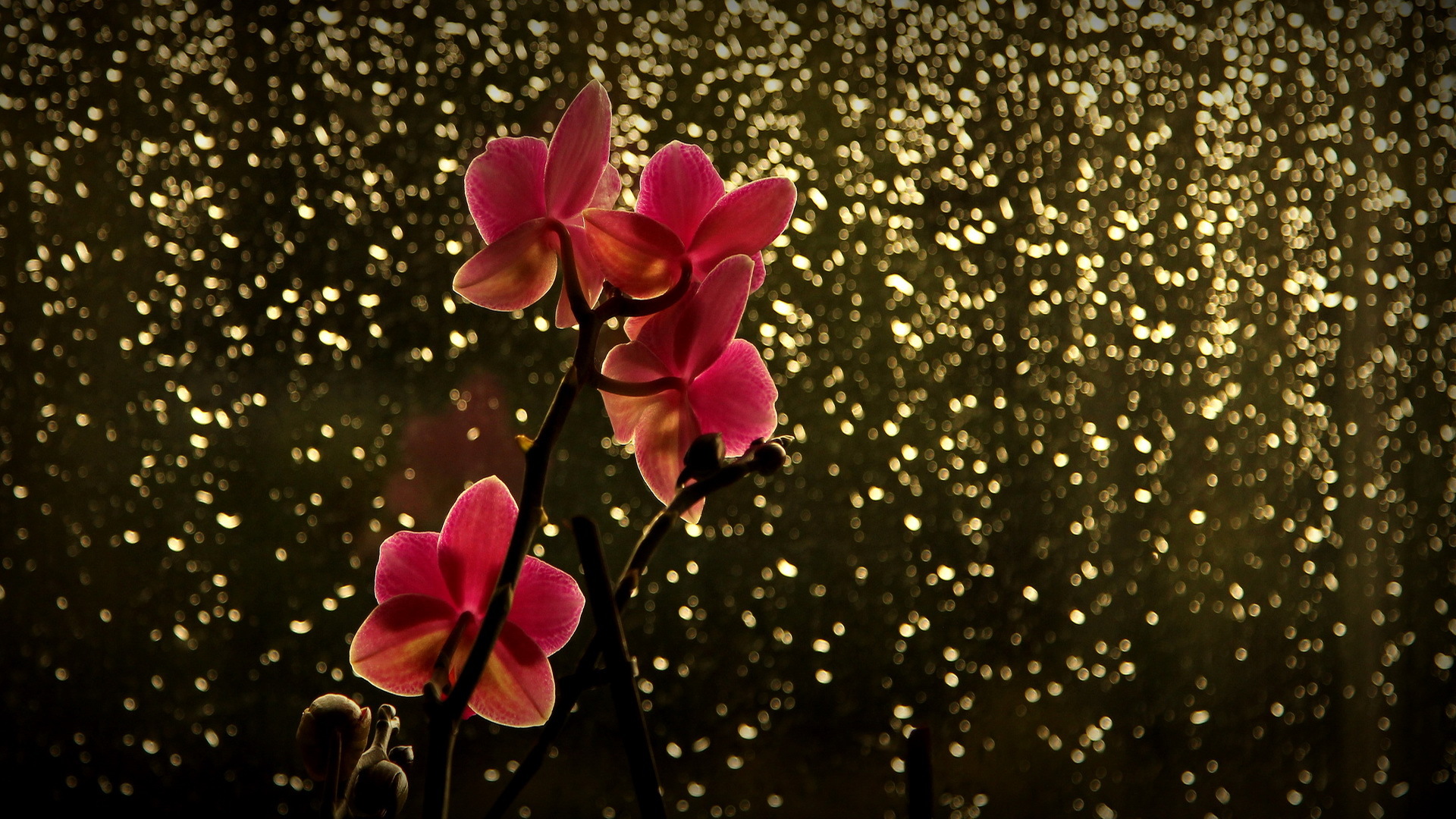 Description: A close up of a flower with a rain droplet background in the background of a window with a raindrop.