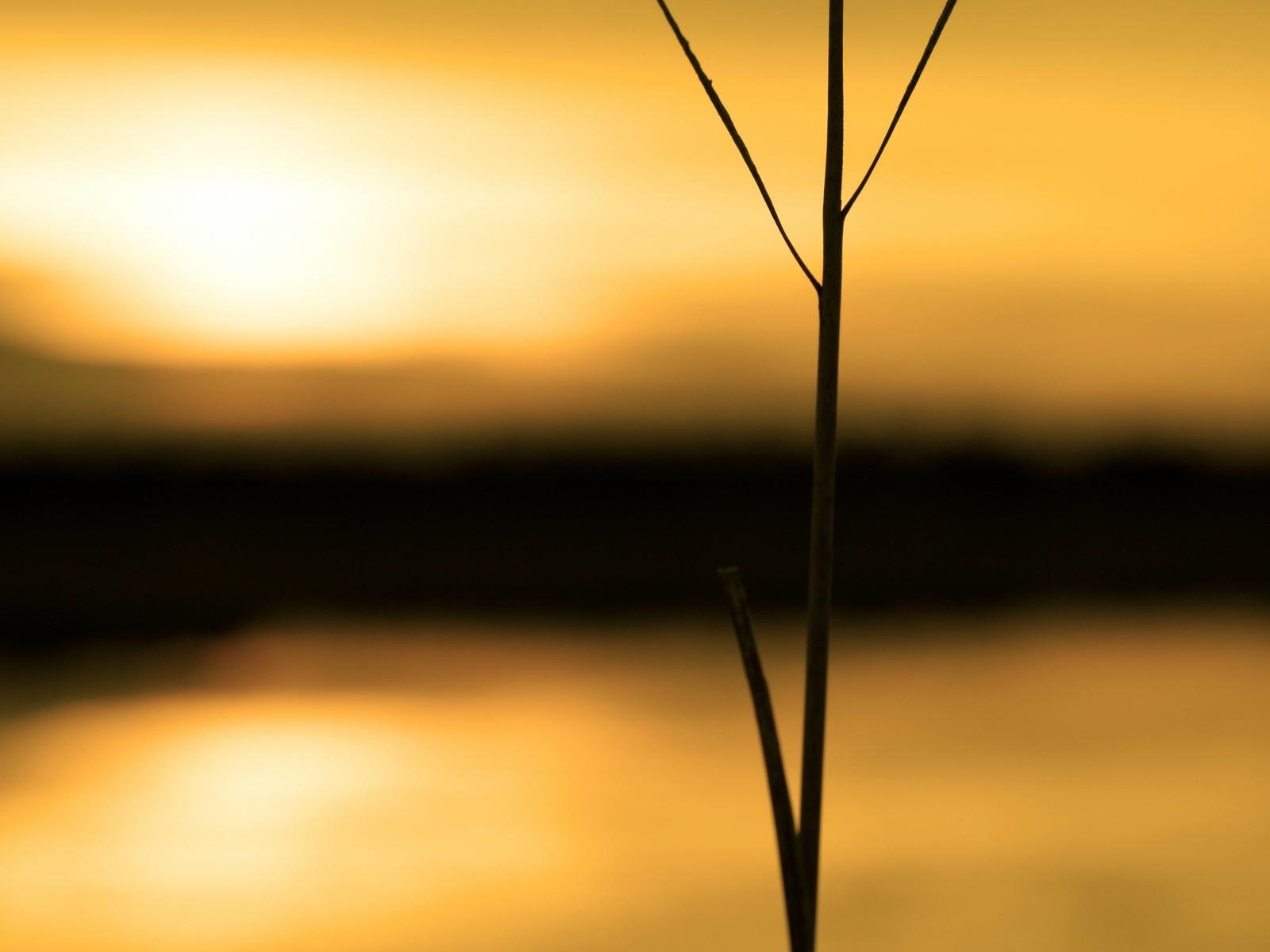 Description: A single flower is shown in front of a sunset over water with a small bird perched on top of it.