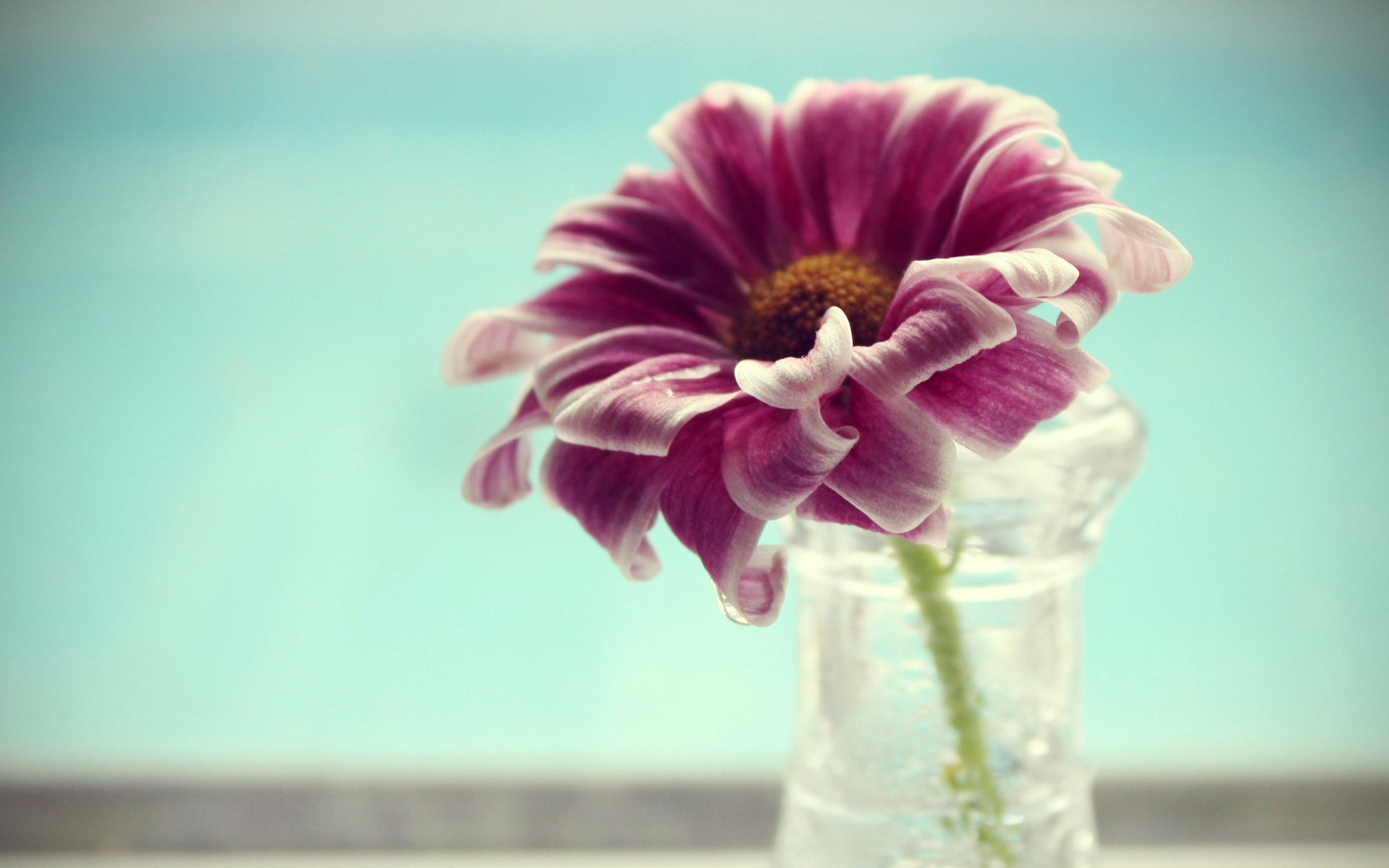 Description: A single flower in a clear vase with water in it's bottom half is shown in the foreground.