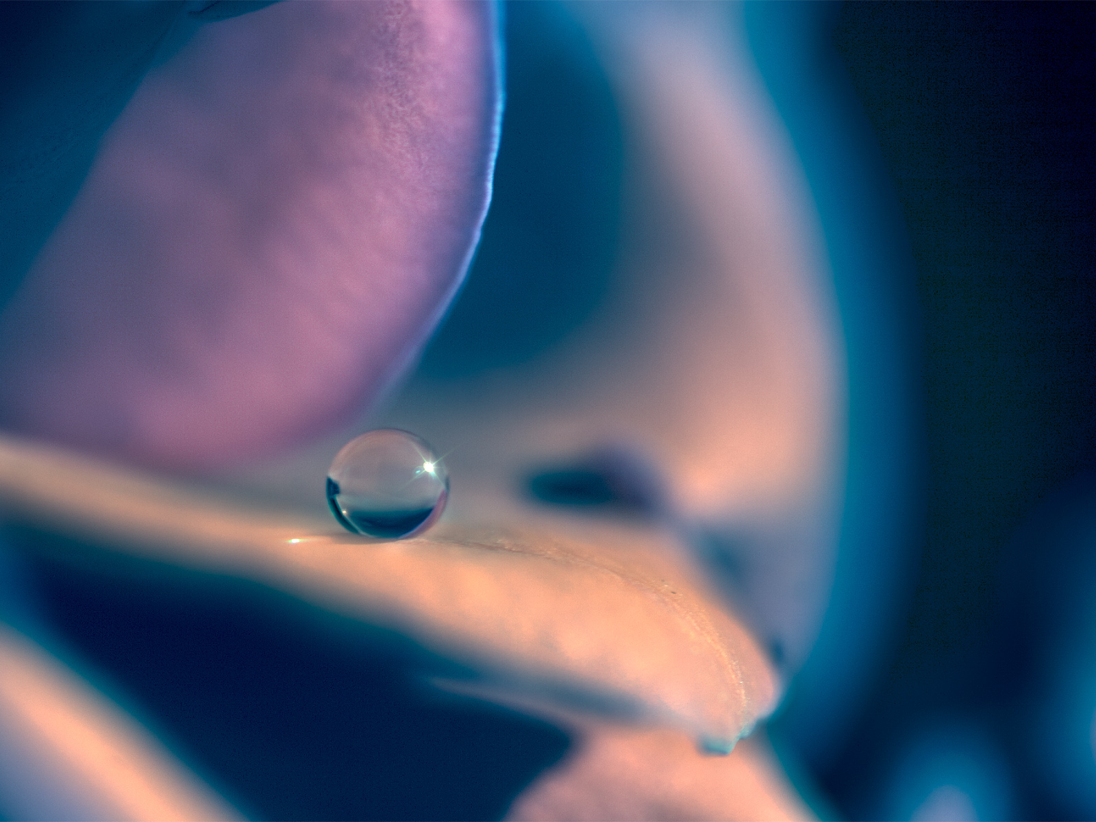 Description: A close up of a flower with a drop of water on it's petals and a blue background.