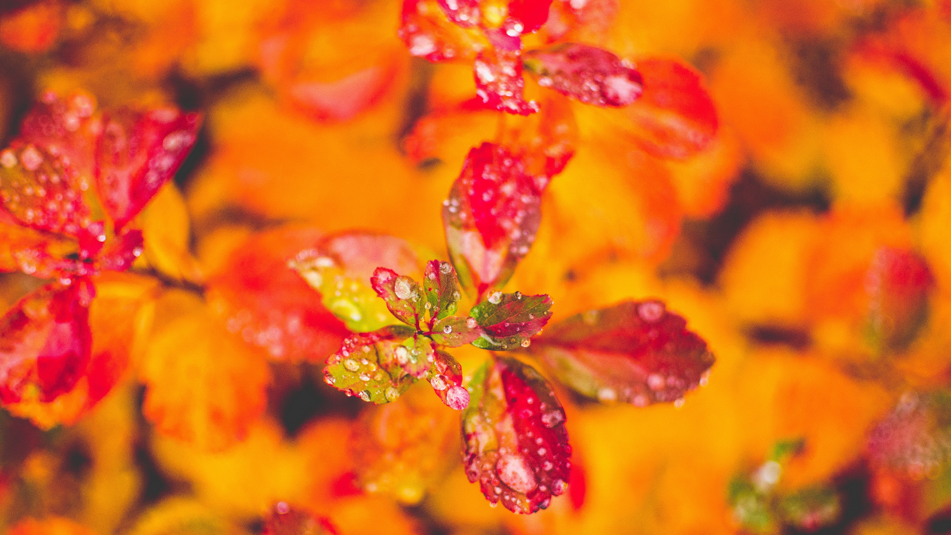 Description: A close up of a flower with water droplets on it's petals and leaves.