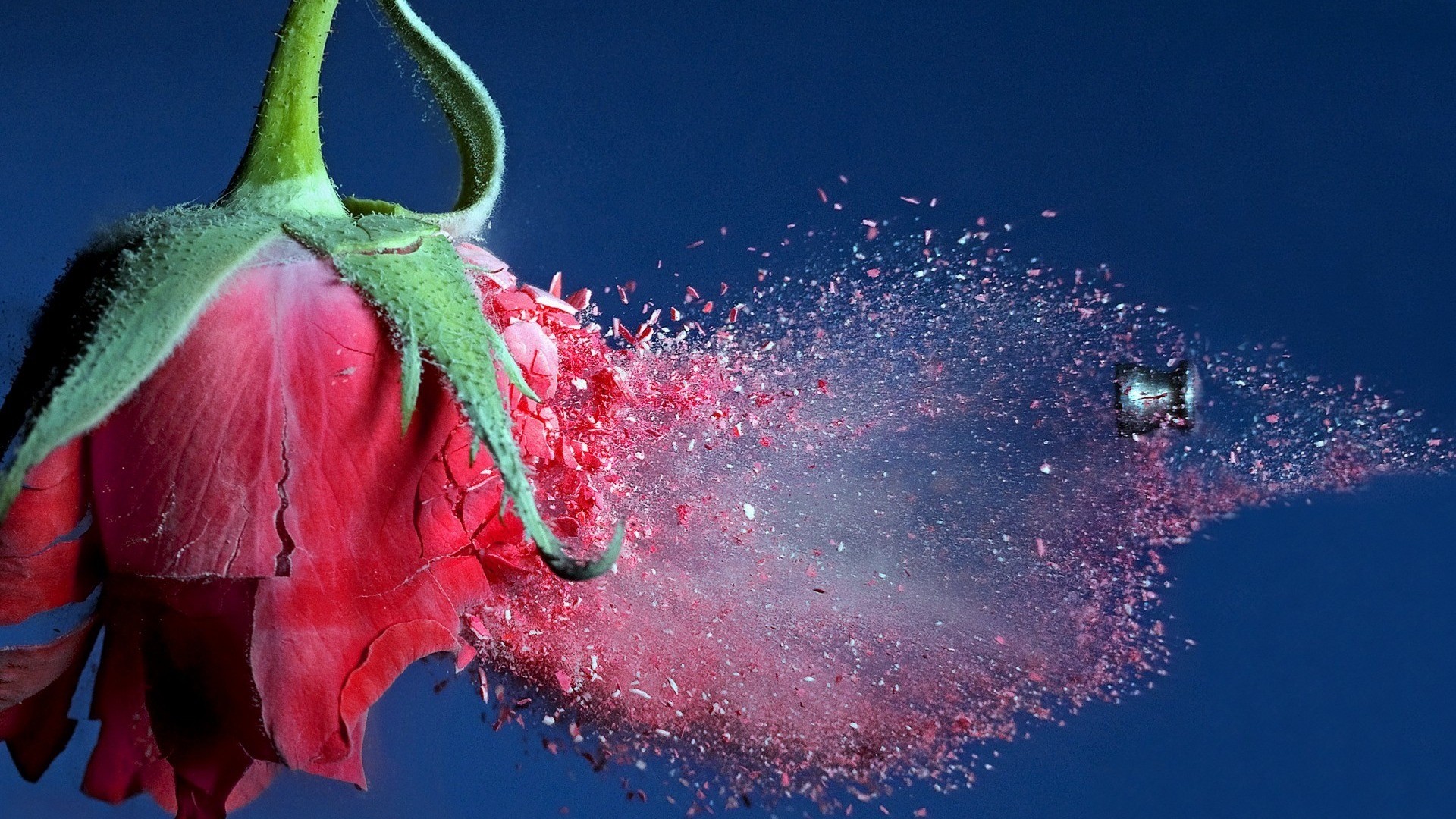 Description: A flower with a sprinkle of water on it's back end and a bird flying in the background.