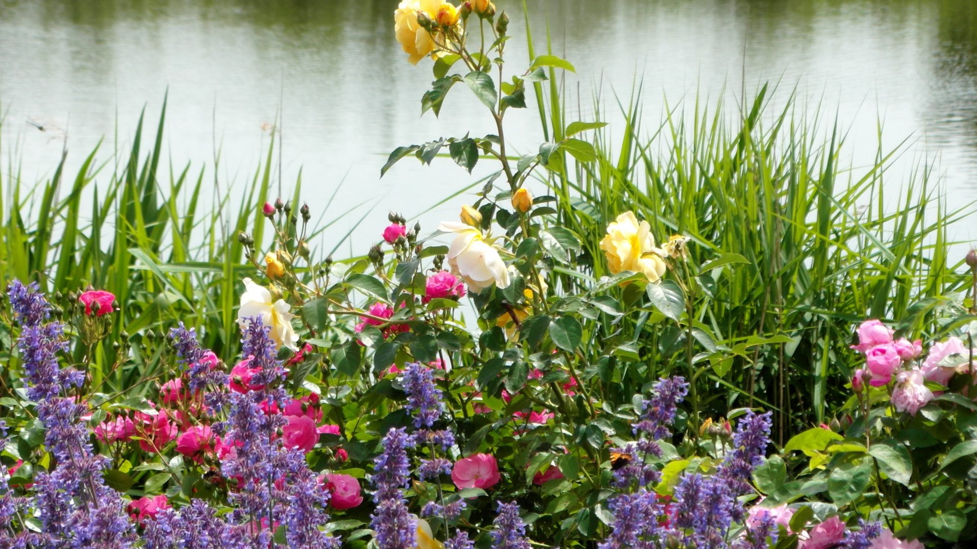 Description: A bunch of flowers that are by some water and grass and some water plants and flowers are in the foreground.